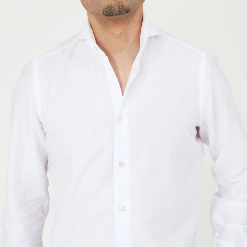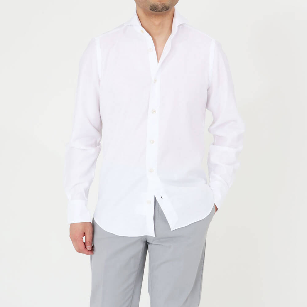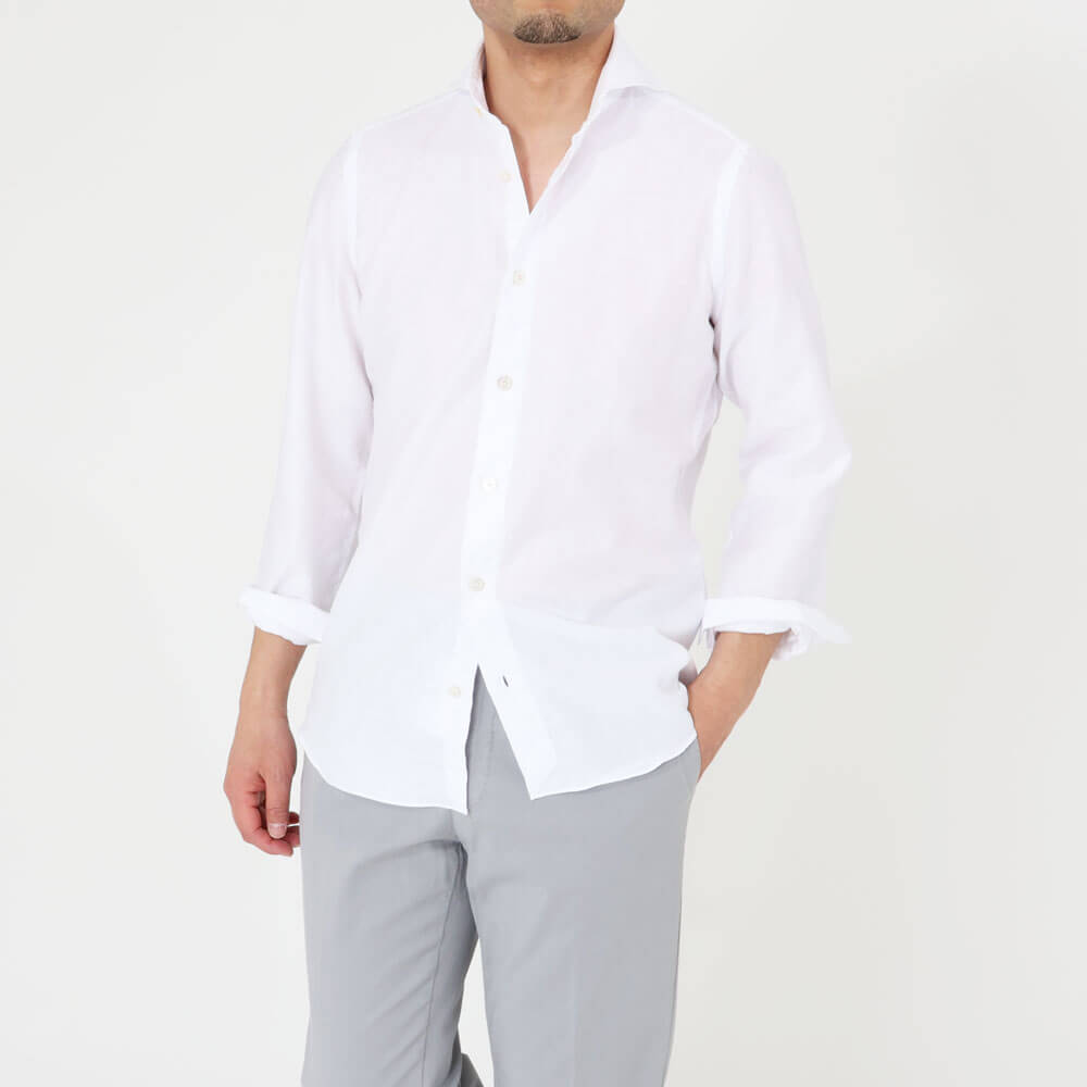 ・生地はリネンの清涼感とコットンの柔らかみを備えたコットン&リネン。リネン100%よりもシワが柔らかく入り、清潔感のある一枚です。1色のラインナップ。