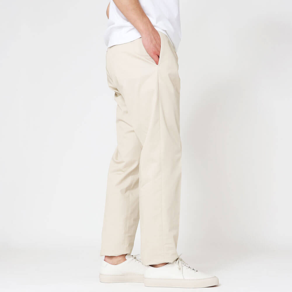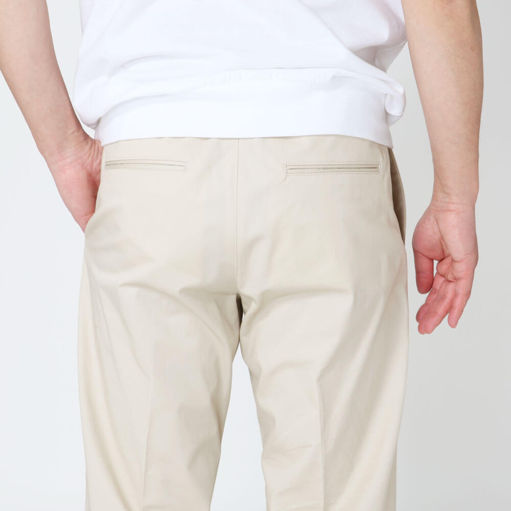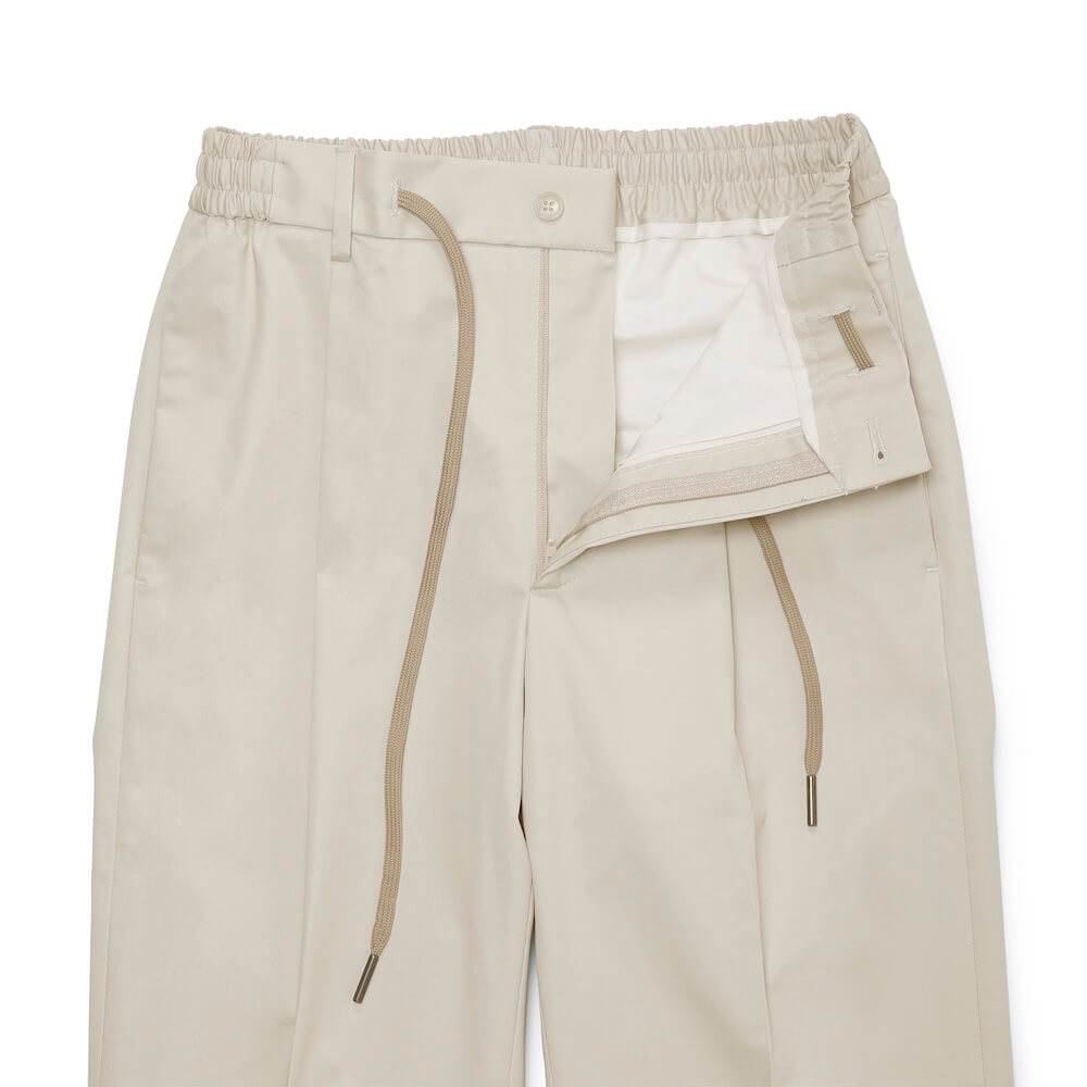 ・組下となるのは、ウエストシャーリンゴム&ドローコード付きのリラックスパンツで1プリーツ。腰廻りとワタリはほんのりゆとりがありつつも、美しくテーパードしたシルエットによってスッキリとした印象を与えます。