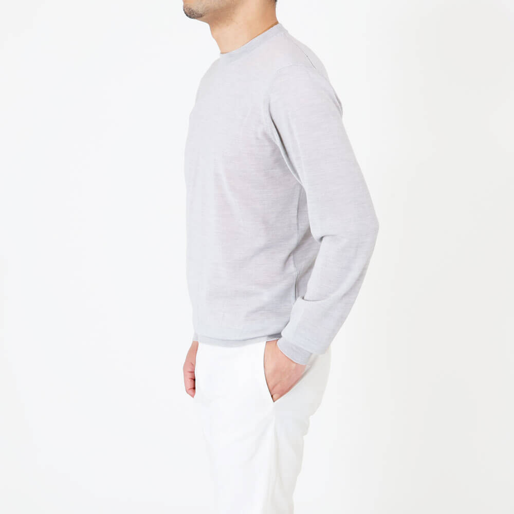 ・ほぼオールシーズン着られるのはハイゲージの天然繊維ニットならでは。軽快な着心地をお楽しみ頂けます。全4色(ブルーグレー/ネイビー)のラインナップ。