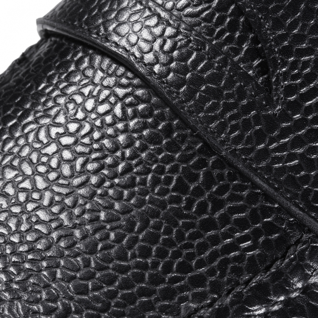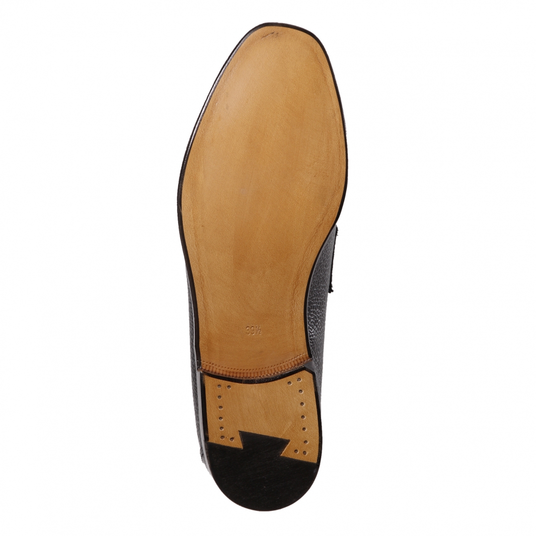 ・「F.LLI Giacometti (フラテッリジャコメッティ)」は、イタリア国内外の高級タンナーと関係が深く、クオリティーの高い素材を使用する事が可能です。こちらのアッパーは、カーフで名高いフランスはデュプイ社のもの。しっかりとした厚みがあり、傷が目立ちづらい耐久性抜群のスコッチグレインレザーです。こちらのブラックはシボの美しさが際立ちます。