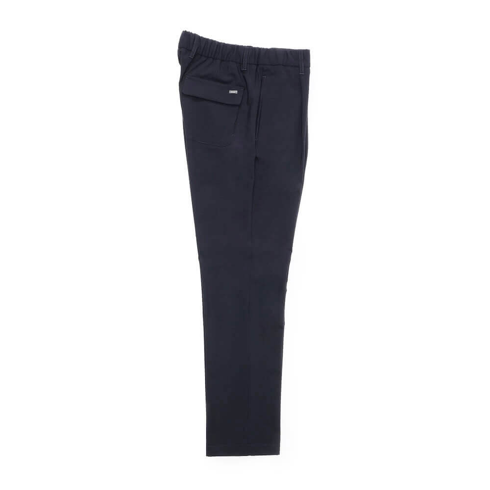 サイズXSを着用し、ちょうど良いサイズ感でした。サラッとした生地の質感が良く、深みのあるネイビーの色合いと艶が高級感を漂わせます。キックバックのある伸縮性もあって穿き心地は快適。日常使いはもちろん、ビジネスシーンにも対応できる一本です。