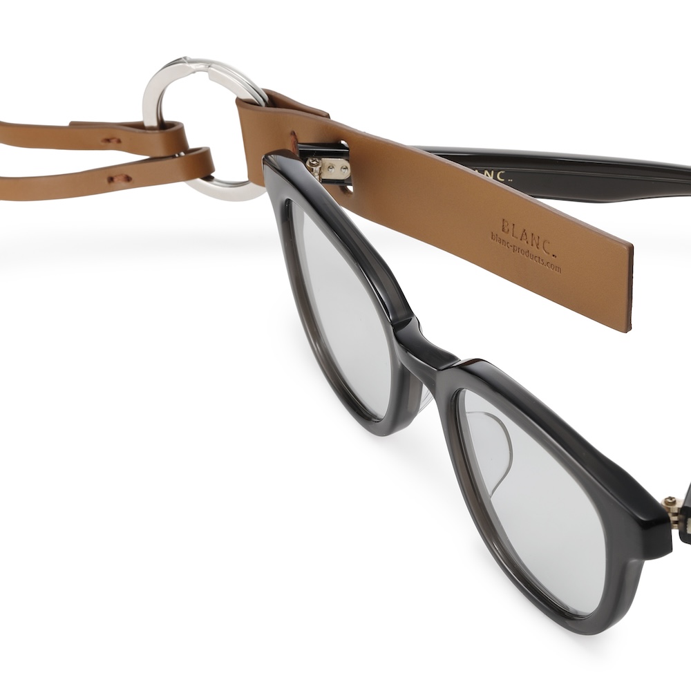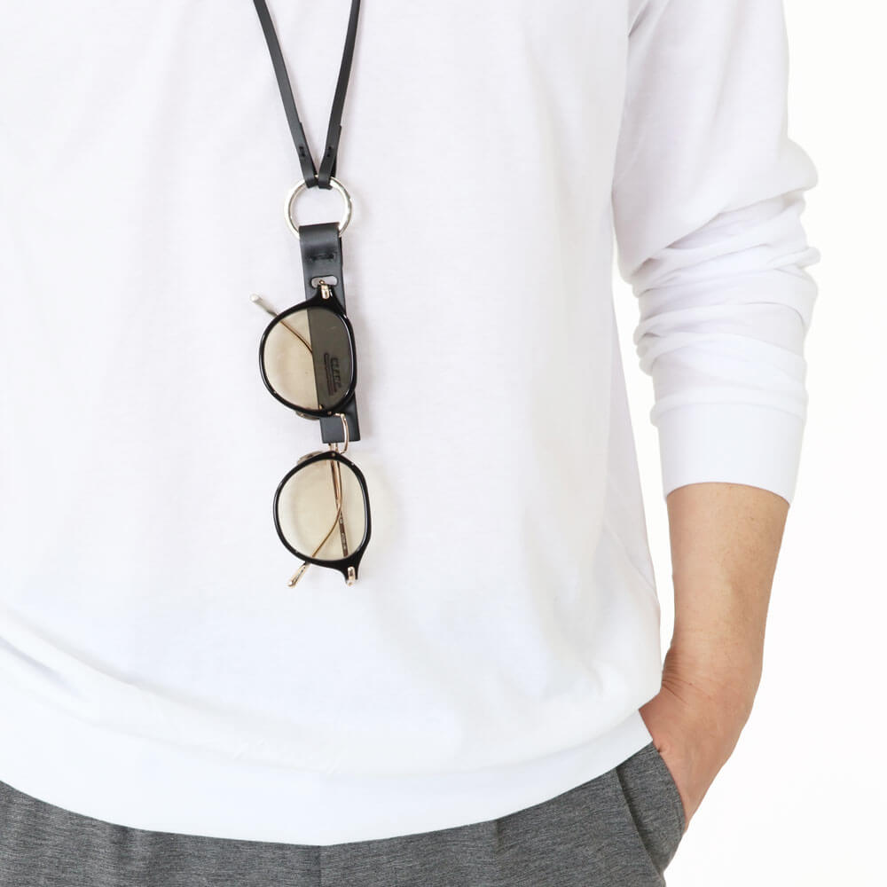 ・シンプルなデザインのストラップは、レザータグのスリット部分にテンプルパーツを通すことでアイウェアを首から下げられるようにしたアイテム。