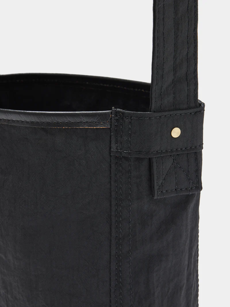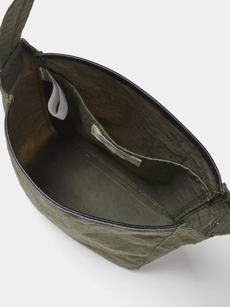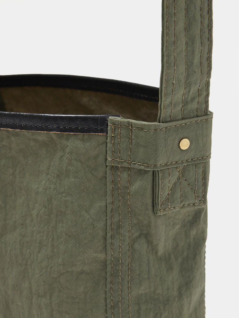 素材の風合いを生かすため裏地を付けず、軽量な仕上げ。また、付属革には”丘染め”と呼ばれる芯の茶色を残した染色が特徴のヌメ革を使用し、切り目を生かしたディテールもポイントにしている。
