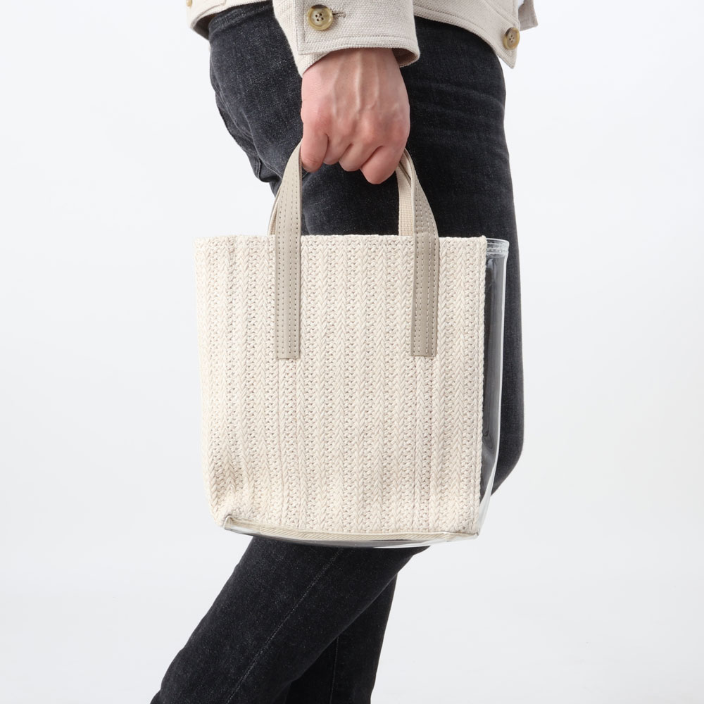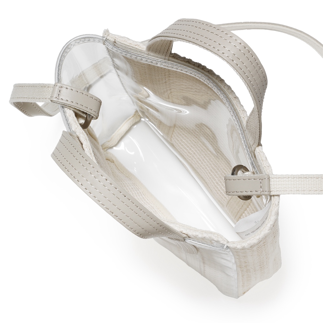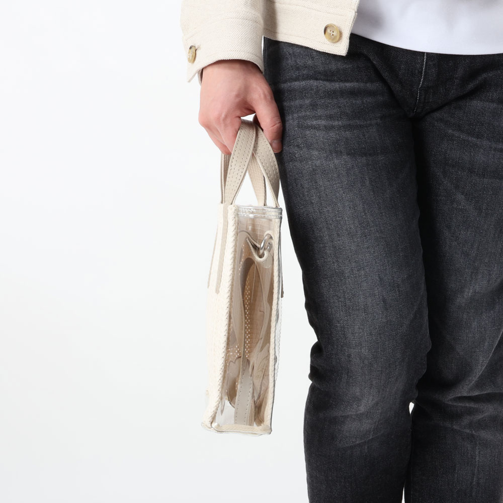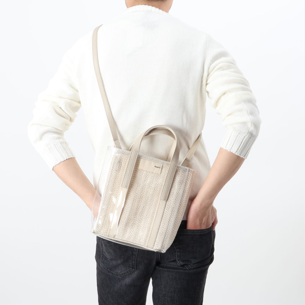 カゴを彷彿させるコットンメッシュの素材感に涼しげなクリアPVC、高級感を感じさせるハンドルとストラップのレザー使いが特徴。 ストラップは男性でも女性でもナナメ掛けができる長さで設定。