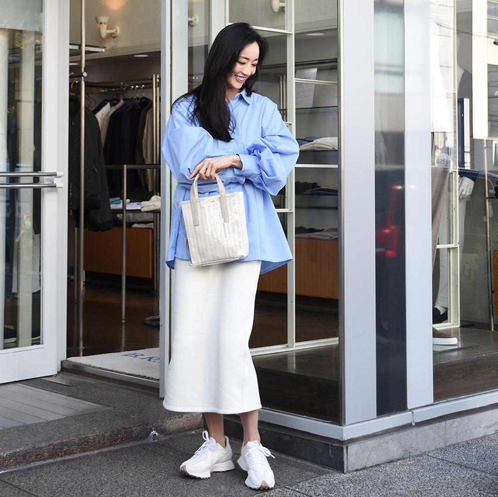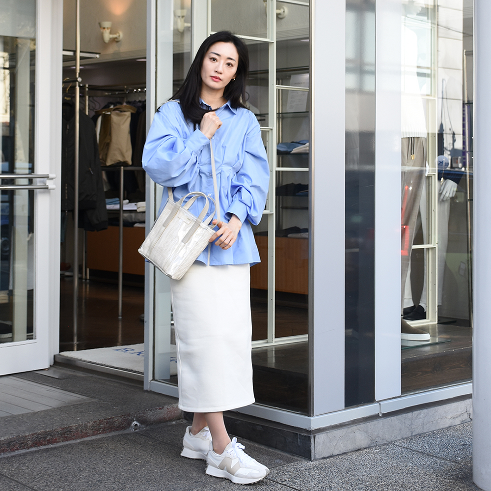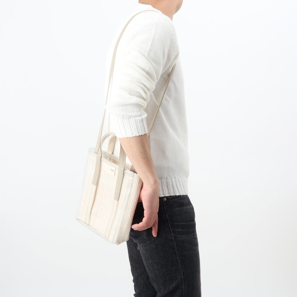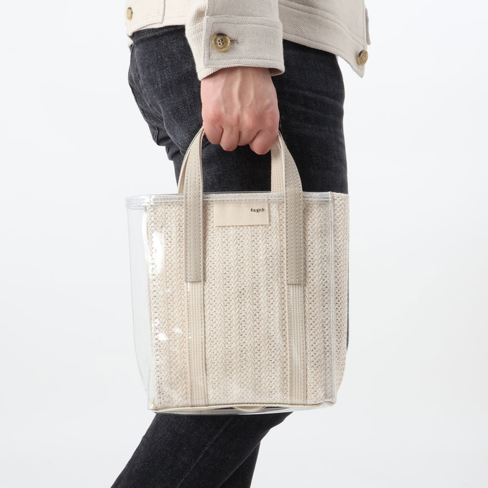カゴを彷彿させるコットンメッシュの素材感に涼しげなクリアPVC、高級感を感じさせるハンドルとストラップのレザー使いが特徴。 ストラップは男性でも女性でもナナメ掛けができる長さで設定。