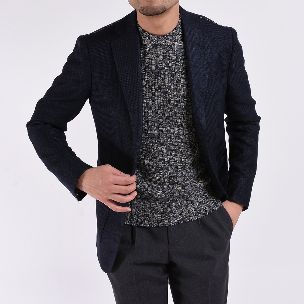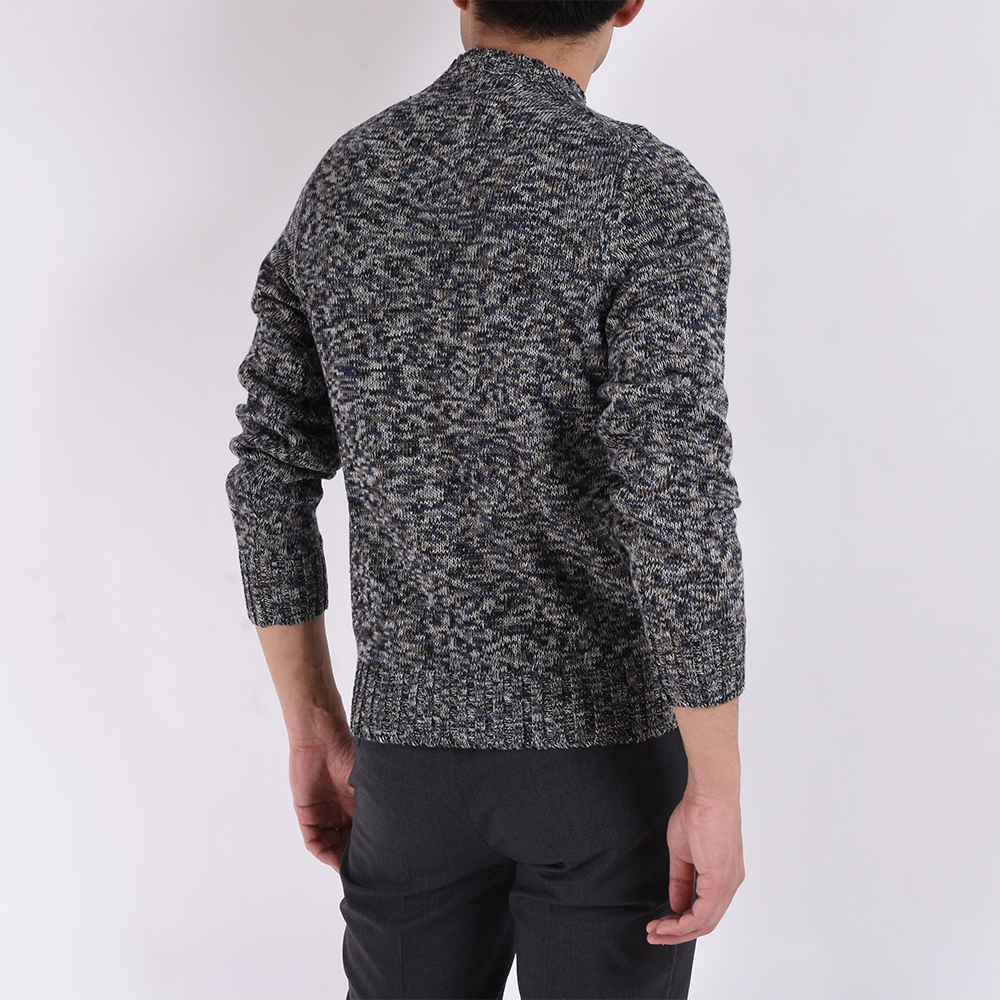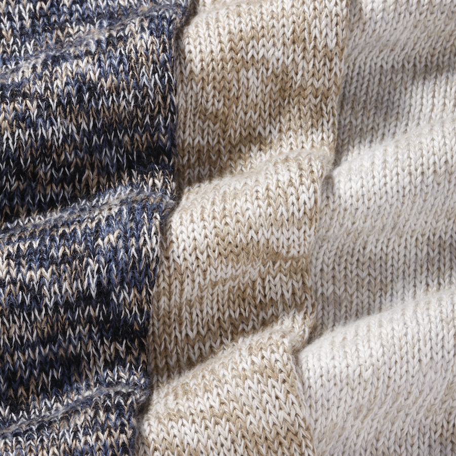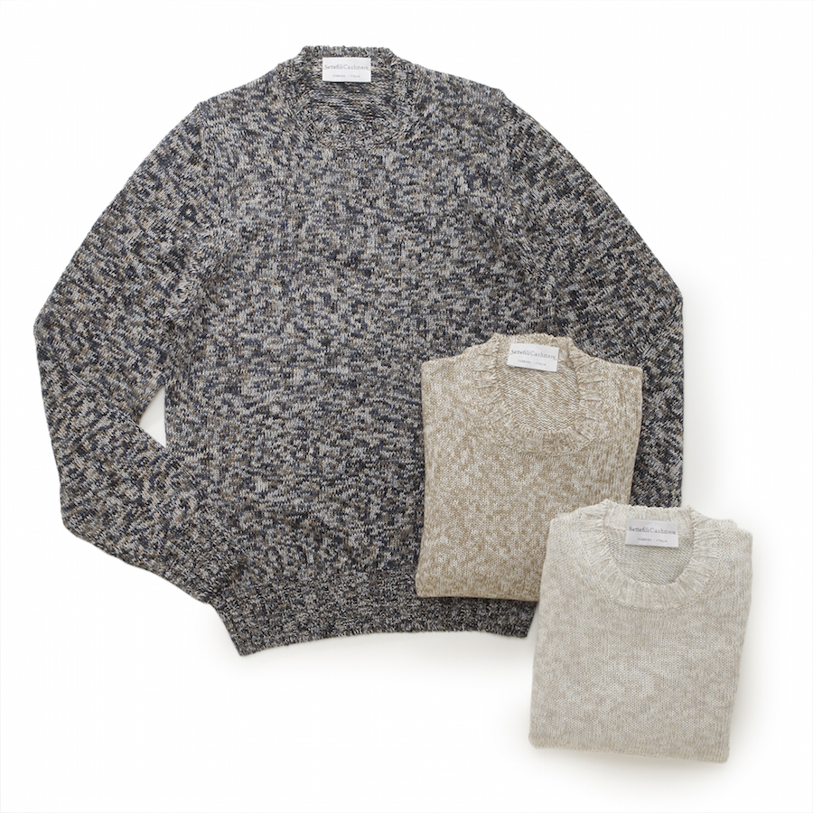 ・素材はリネン&コットン。細い糸を撚り合わせてミドルゲージにしており、リネン特有のザラっと感のない柔らかみのあるタッチです。もちろん、素肌でも快適な着心地。こちらはメランジ糸を使用した表情豊かな1枚。