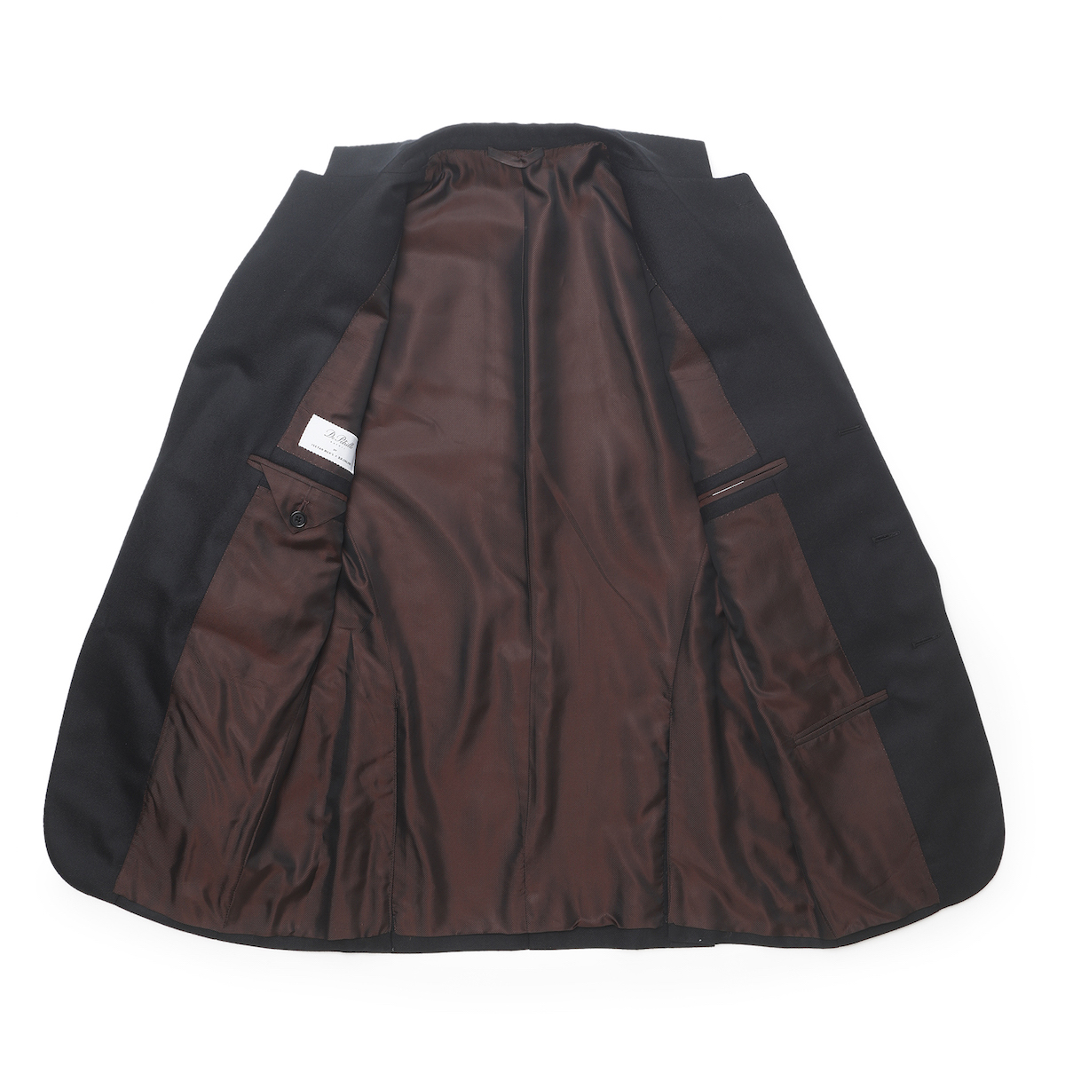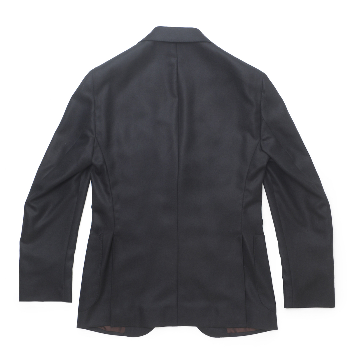・生地は"Lanificio di Pray(ラニフィーチョ・ディ・プレイ)"のカシミア100%綾織り。フワッと柔らかく品の良い光沢はカシミアならでは。さらに柔らかさゆえのドレープ感も味わえ、至極の一着に。ネイビーではなくブラックのカシミア100という点に両社でこだわりました。目付は290グラム。