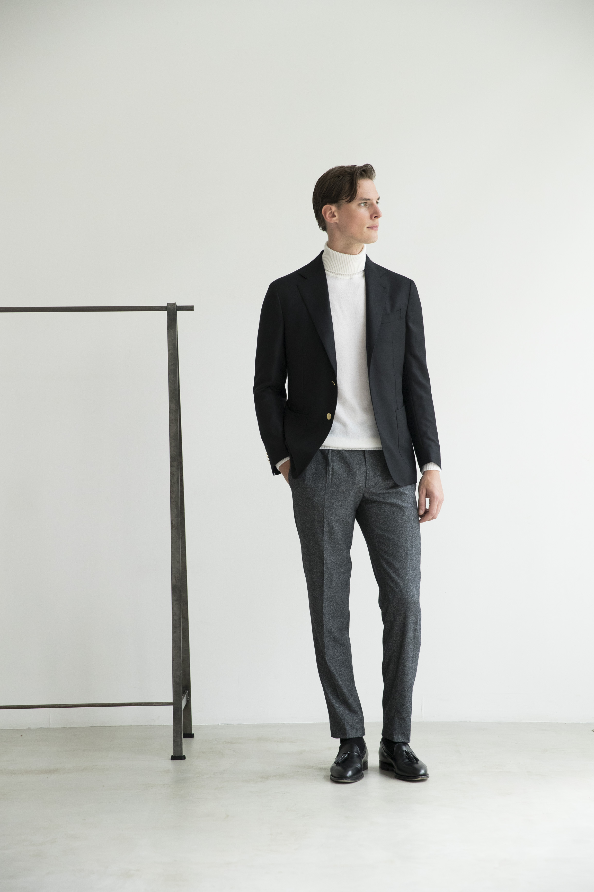 ・タイドアップはもちろんのこと、タートルネックなどのニットでスマートに着こなすのもオススメです。
