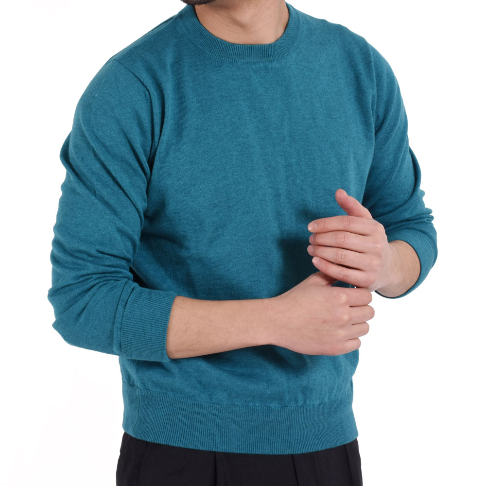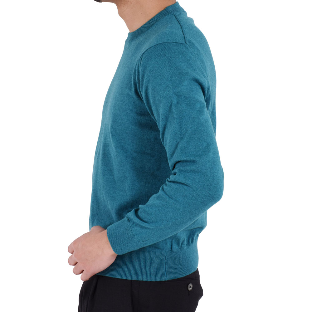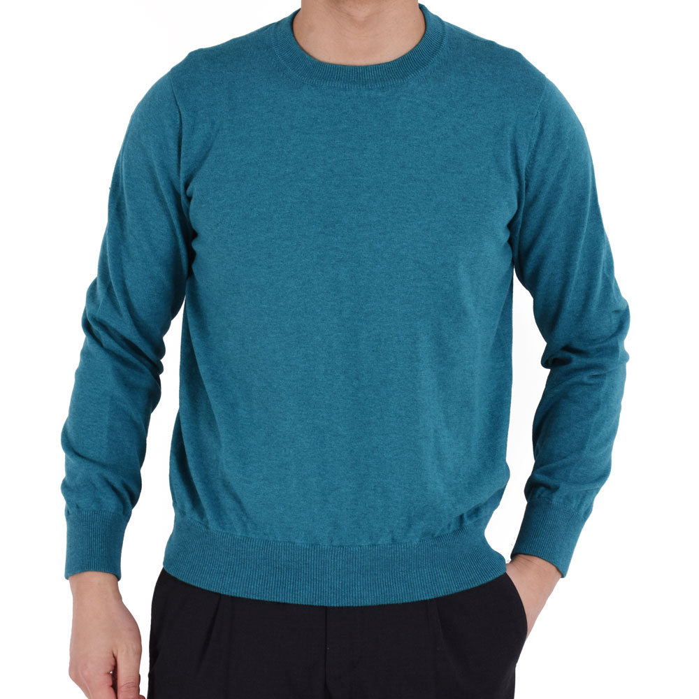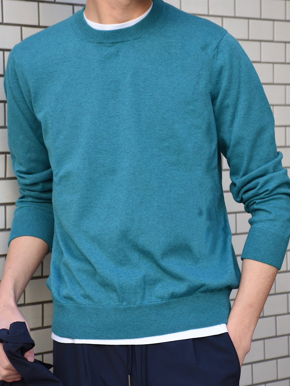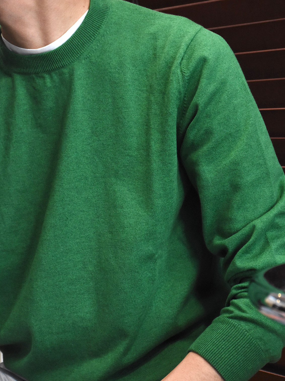・目の詰まったカジュアル感ある風合いから通称"スウェット風編み地"と呼ばれ、着れば極上のリラックスムードを醸す今の時代感にピッタリな編み地です。その編み地を使ったクルーネックに上品さを加えるべく、ネックリブ幅を細め(およそ2.5センチ)に別注しました。