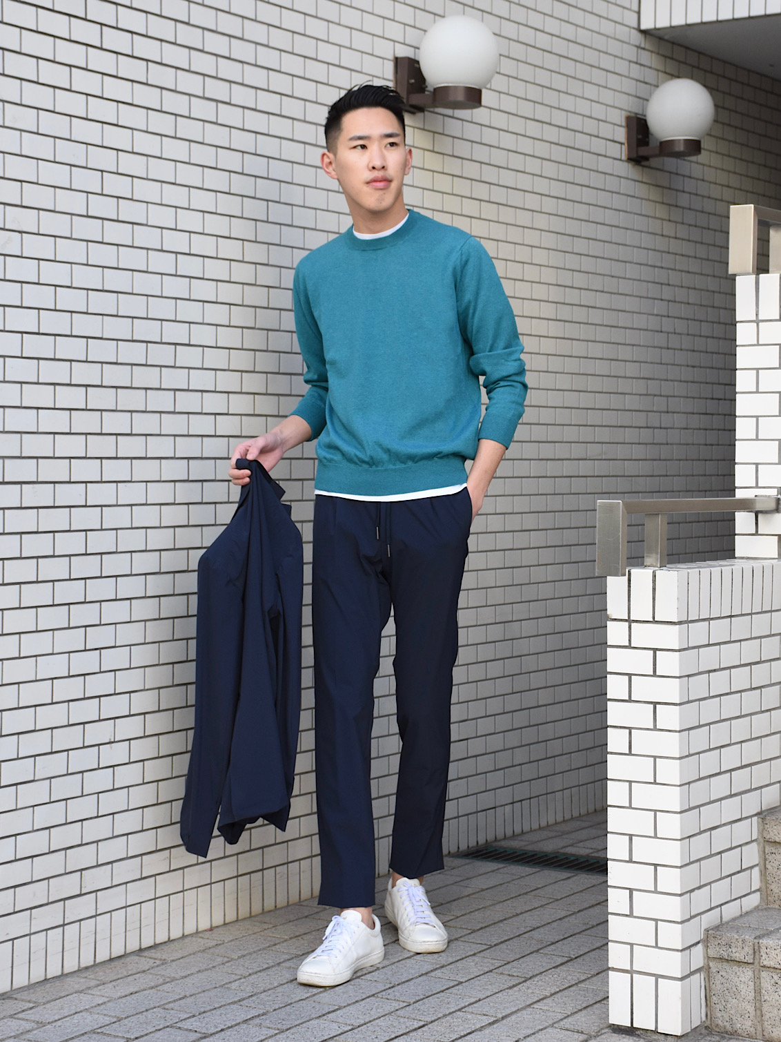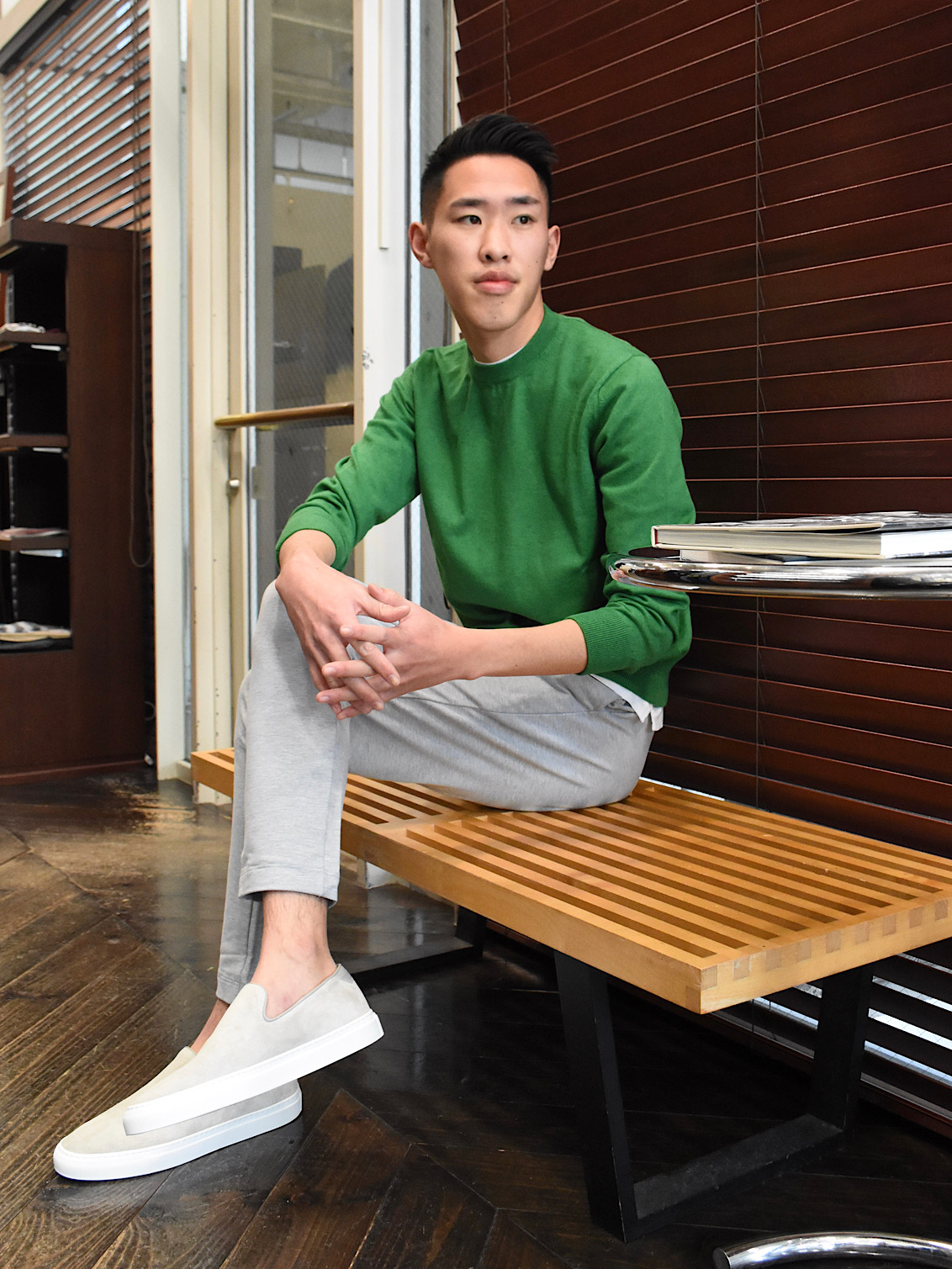 ・グリーンのニットにライトグレーのスウェットパンツを合わせたリラックススタイル