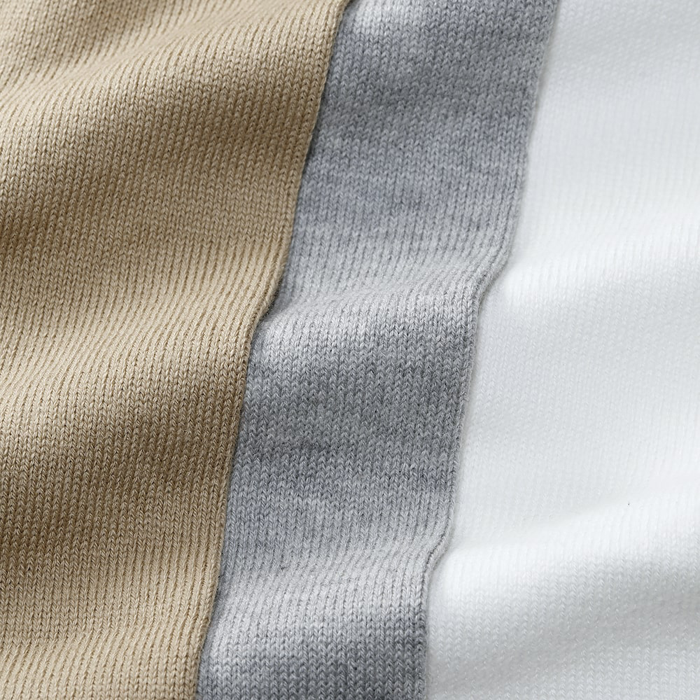 ・ラインナップは全7色。同じ編み地で、クルーネック、半袖クルーネックもご用意しました。さらに、ホワイト、ライトグレー、ダークネイビー、ブラックの4色については、パーカーに加え、裾リブ付きニットパンツ、ニットショーツもラインナップ。トップス4型、ボトムズ2型を自由にセットアップで着られるようにしました。