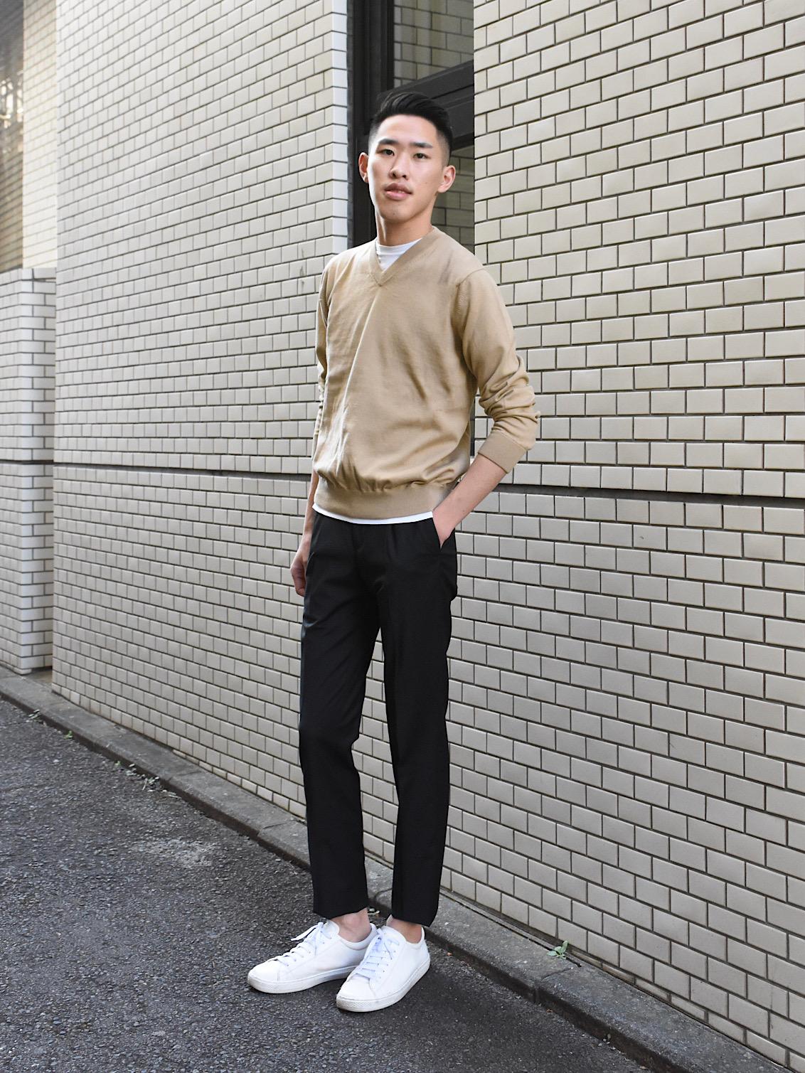 ・ベージュを着用し、黒パンを合わせたちょいモードなスタイル