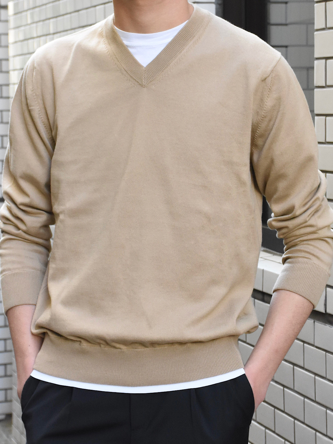 ・もう一つの別注ポイントは全体のスペック。適度なフィット感が得られる肩幅とスリーブ、ほどよくゆとりを感じさせるボディ、Vネックの空き具合やリブのテンションなど細かな部分まで、理想のバランスとフィッティングを目指しました。スタンダードでリラックス感ある美しいシルエットです。