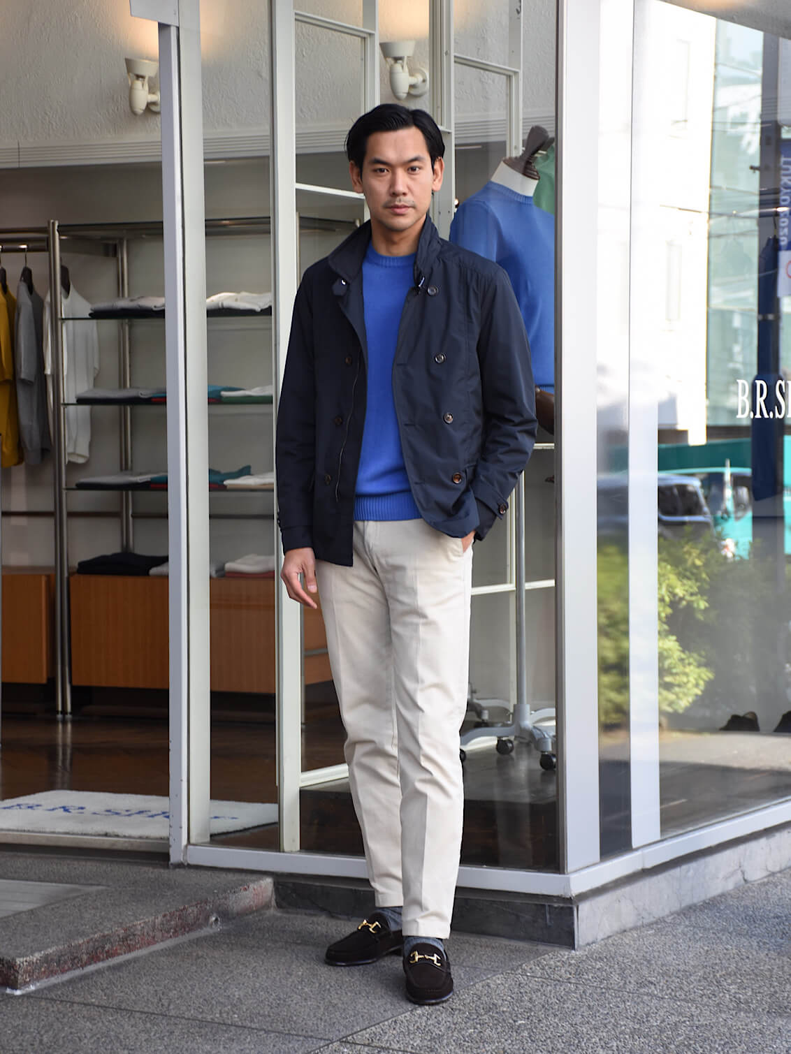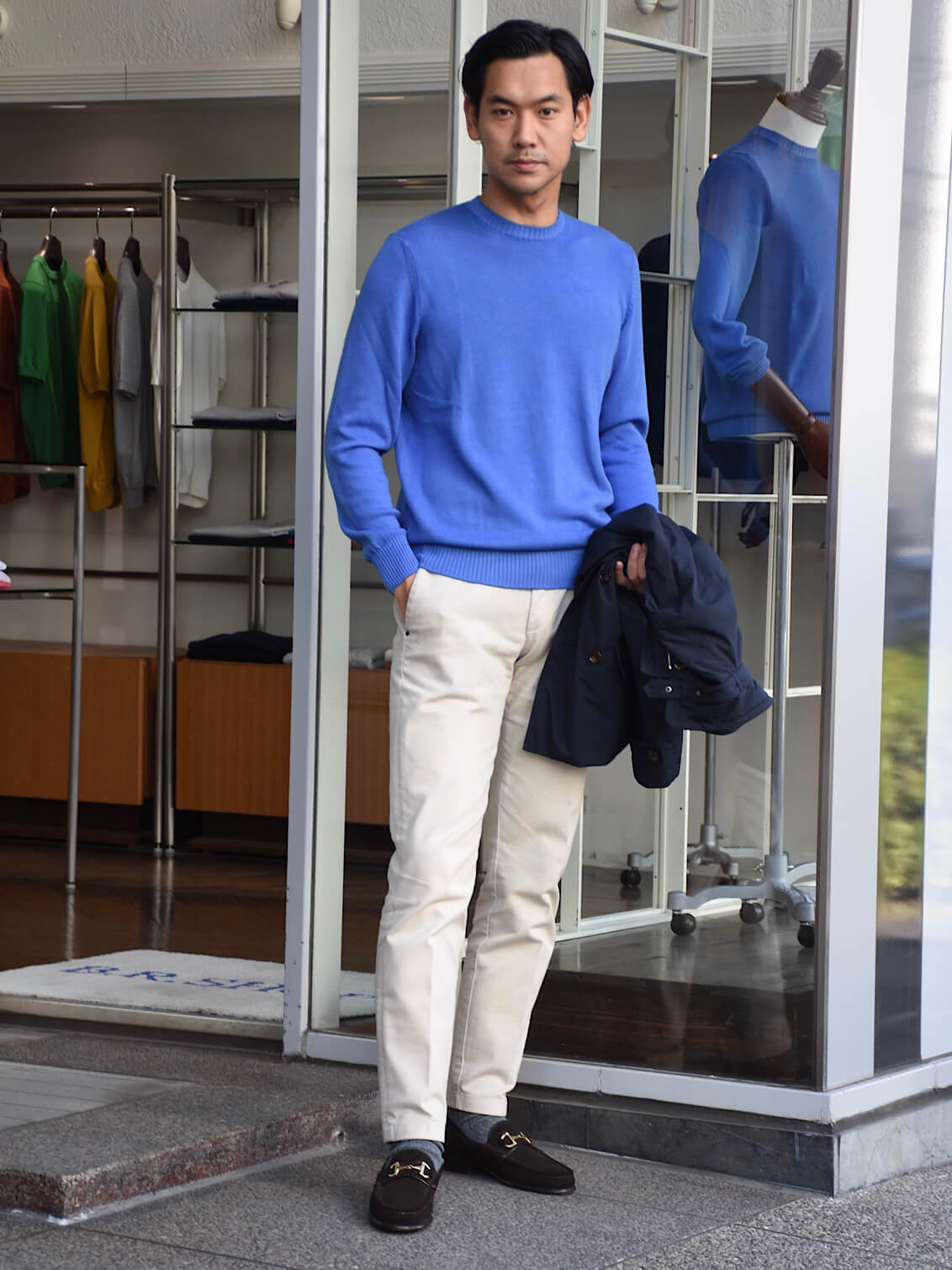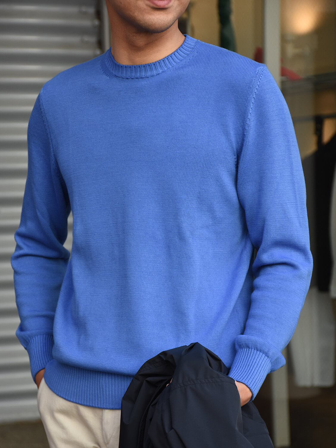 昨年大人気だった8ゲージのコットンニット。柔らかく滑らかな肌触りはさすがフェデリ。 ニットで気になる点と言えば、ネック部分や袖のリブの詰まり加減、そしてシルエット。リブの詰まり加減は非常にしっかりとしていて、個人的に合格◎シルエットも細身体型でサイズ48を着用し8ゲージらしい、ほんのりとゆとり感があり合格◎結果、100点満点の仕上がりのサイズ感なので言う事なしでした!ミドルゲージなので、体型を上手くカバーできるのが良いですよね〜。カジュアルスタイルはもちろん、ジャケットのインナーとしても使えるのでぜひワードローブに追加してみてはいかがでしょうか!