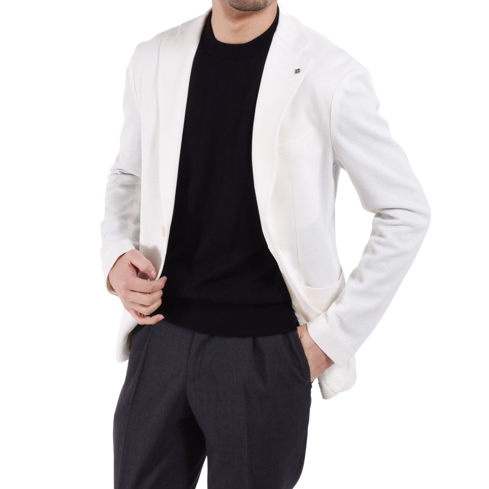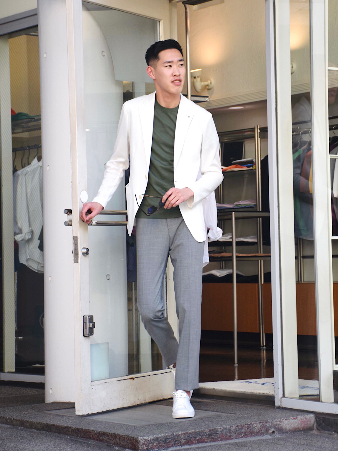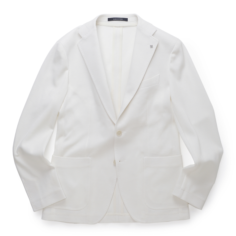 サラリとした肌触りで通気性抜群の生地を使用したタリアトーレのジャケット。モデルはG-DAKAR22Kという事で、軽量感ありながらも身体のラインをきれいに見せてくれるのがポイント。白なので、少々キザに見えがちかと思われますが、ジャージー生地を使用しており、程よくカジュアルなのでそれが良い塩梅に。着心地は伸縮性があって非常に楽!固く見え過ぎず、ほんのりリラックスした印象が今の時代に求められるジャケットの代名詞でもありますね!