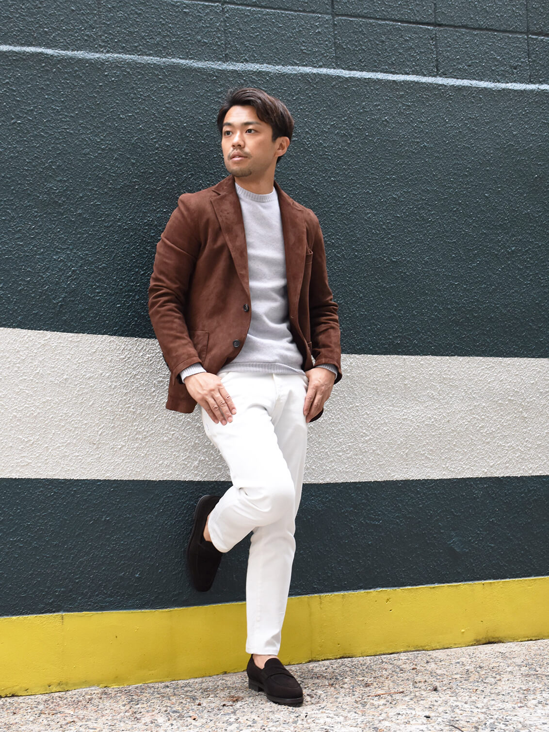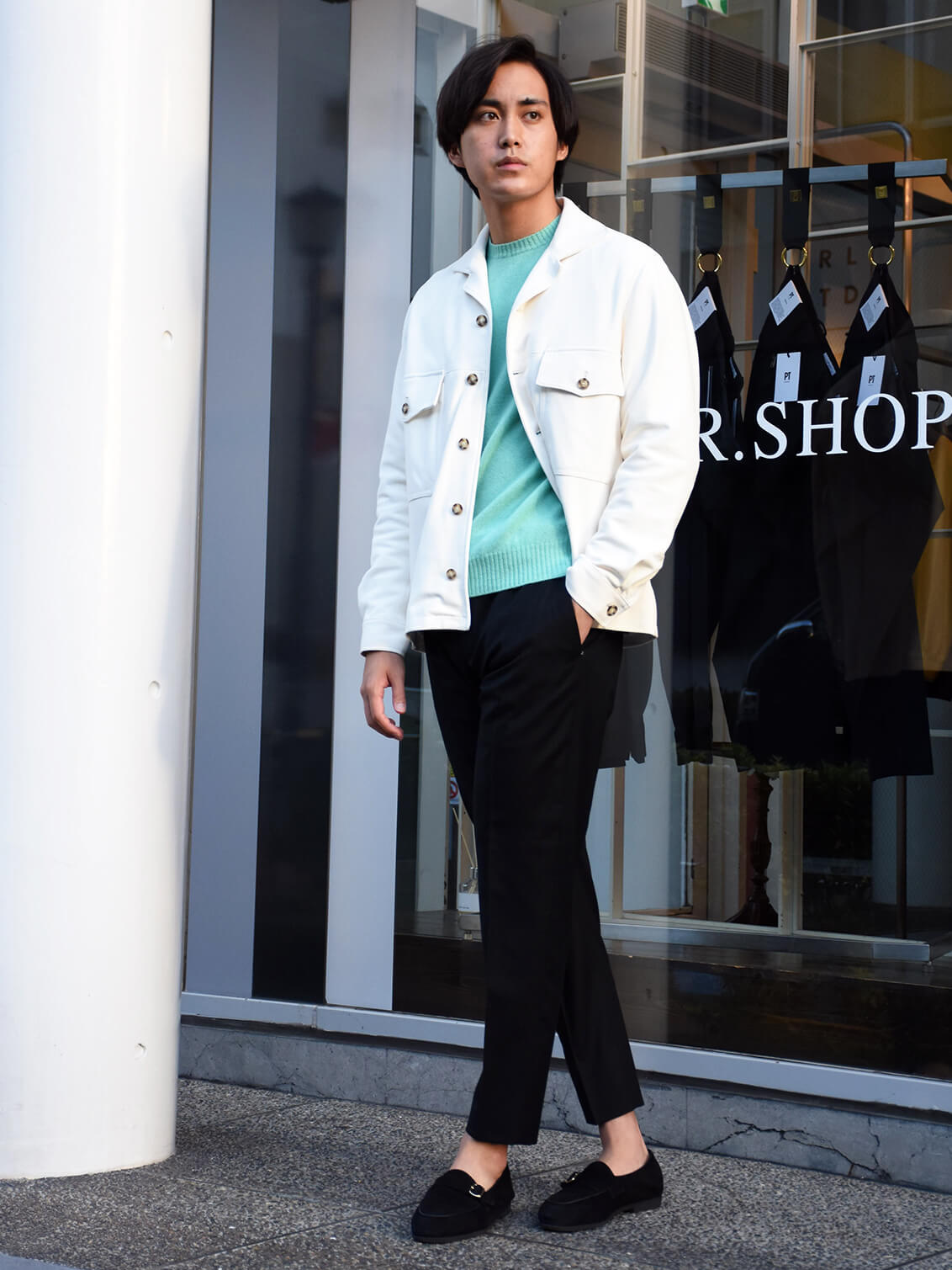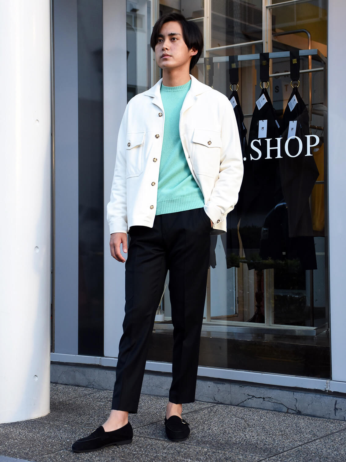 ・パステルグリーンを着用し、ホワイトのレザージャケット、ブラックのパンツを合わせたスタイル/ 身長180センチ/体重70キロで、着用サイズは50です。