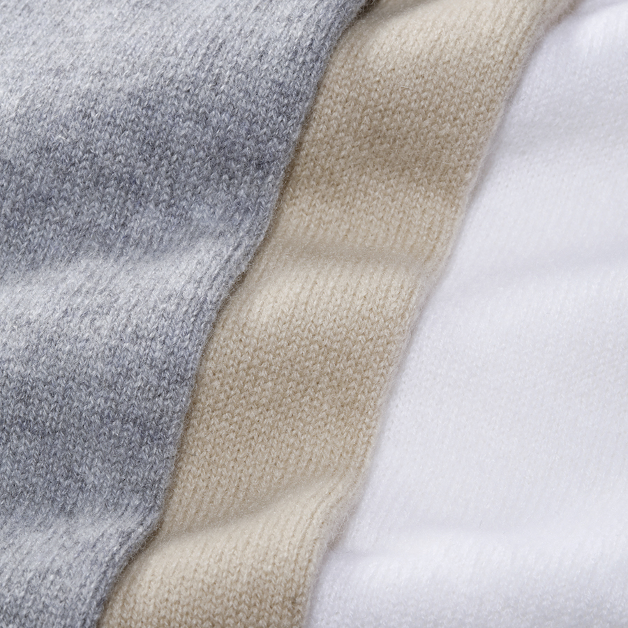 ・カシミア原毛を色によって使い分けているのも「FEDELI (フェデリ)」の特徴です。ホワイト原毛は薄い色目、ブラウン原毛は濃い色目に分けて製品染めすることで、鮮やかで深みある色合いを実現しています。