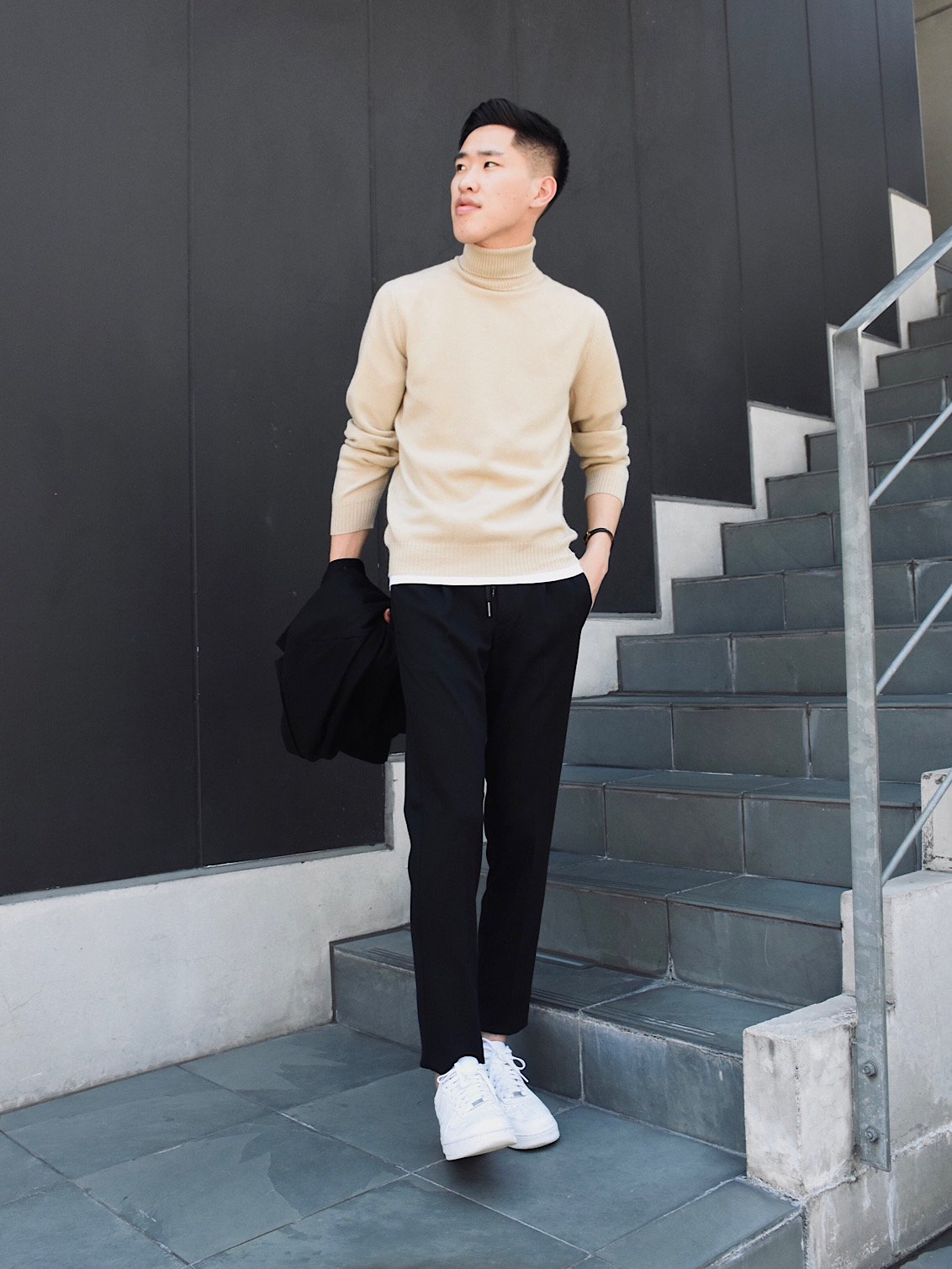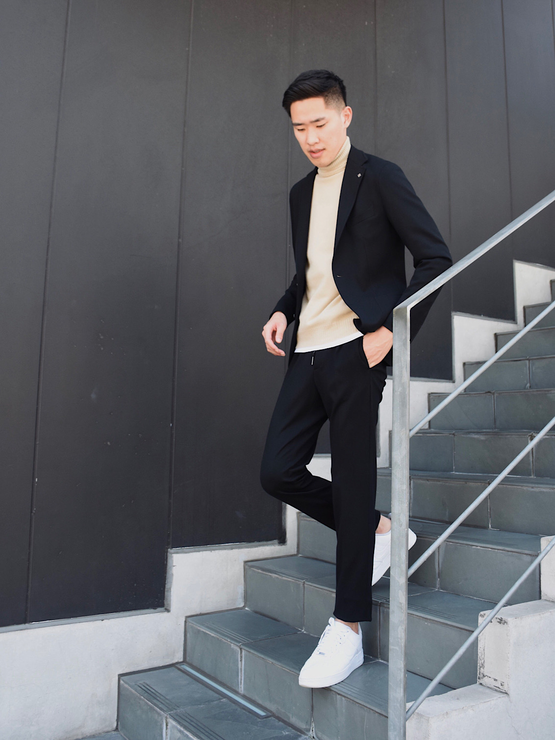 ・ベージュを着用し、黒のセットアップに白スニを合わせたラグカジスタイル/身長183センチ,体重61キロで着用サイズは48です。