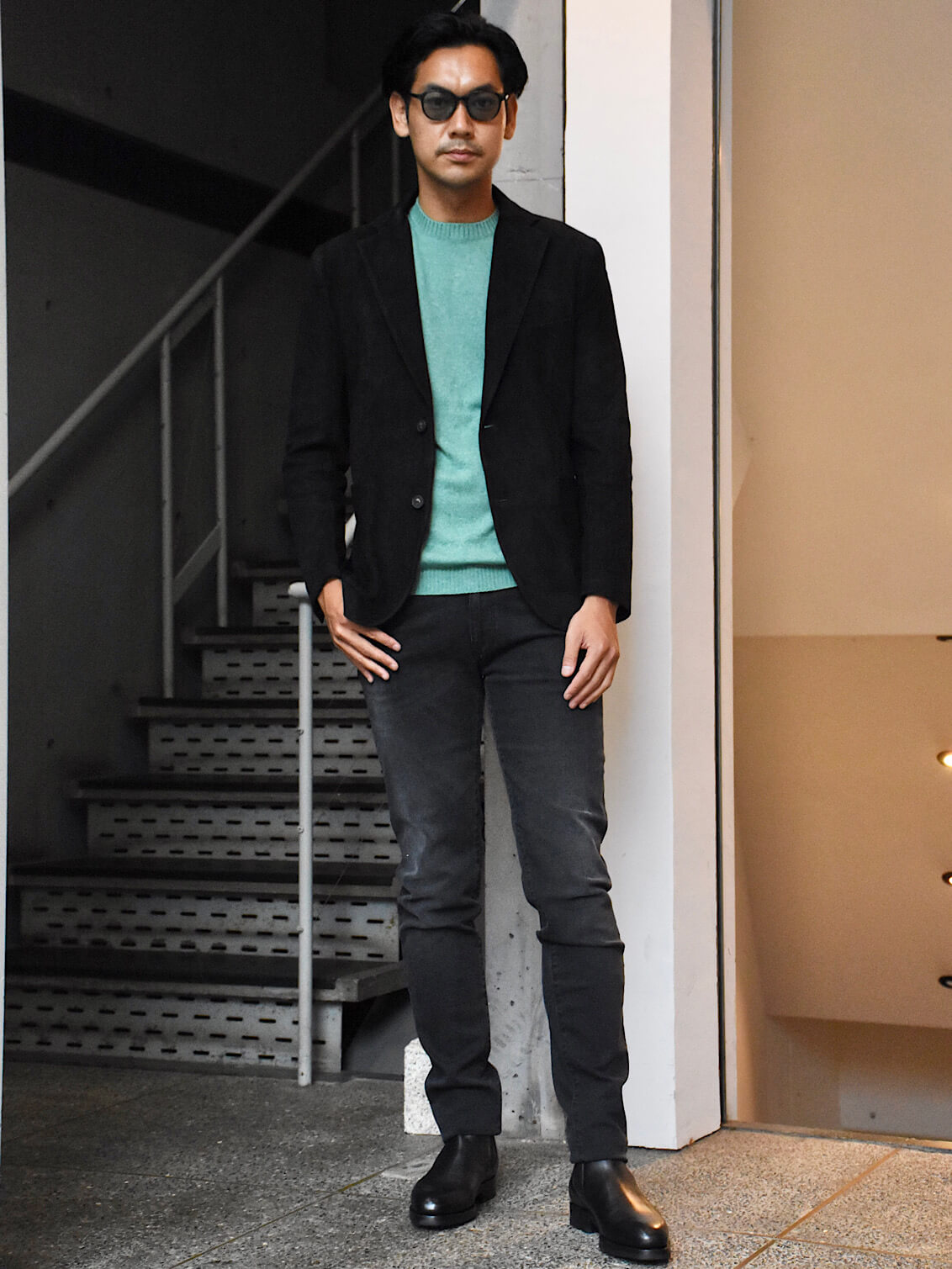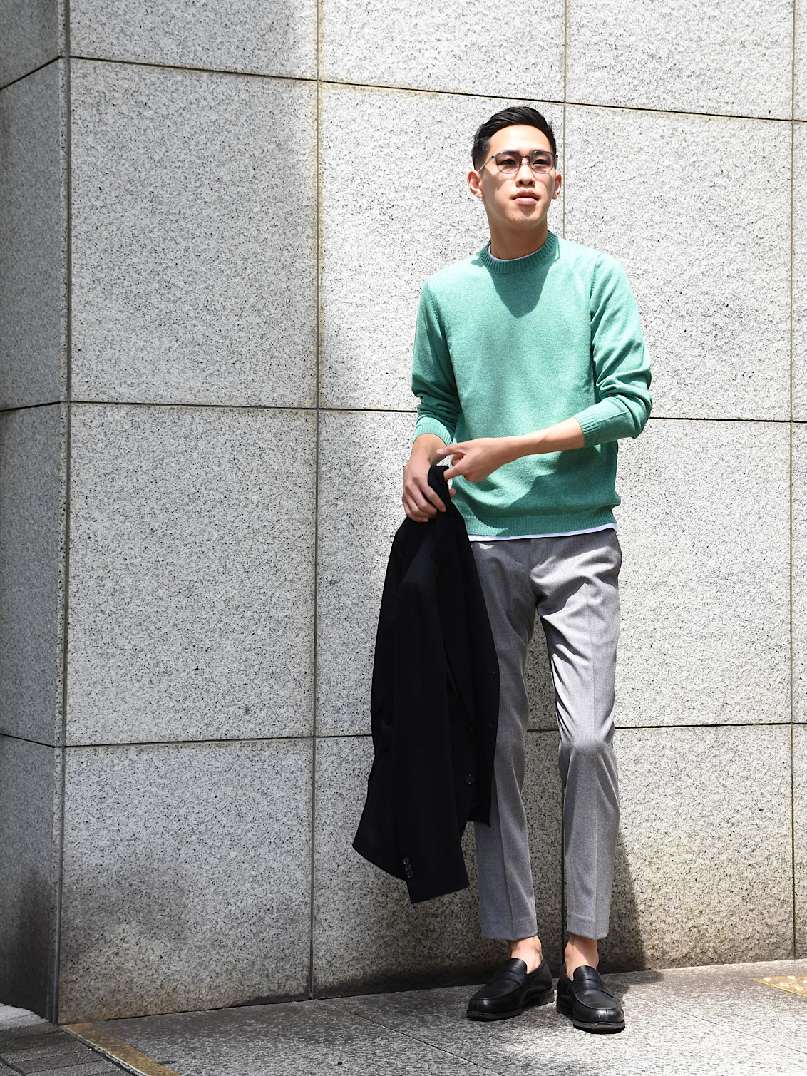 ・グリーンを着用し、ライトグレーのパンツを合わせたスタイル(183センチ/61キロでサイズ46を着用)