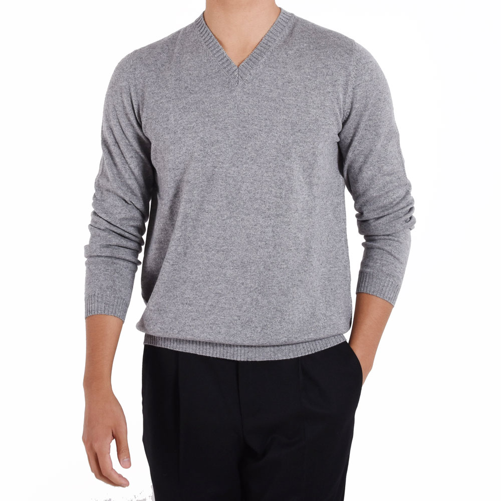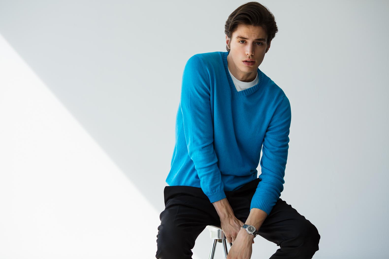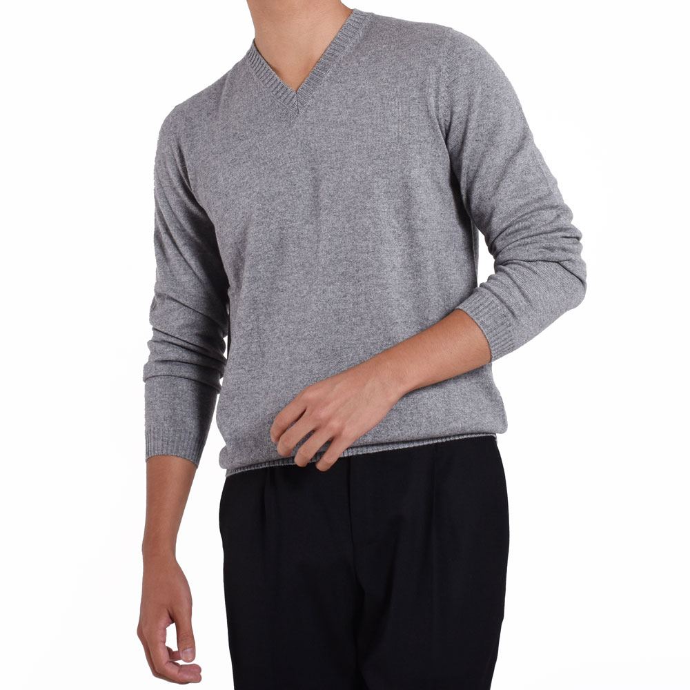 ・元々は幅広だった袖と裾のリブを細めにリクエスト。これによってクラシック感が薄まり、カットソーのような軽い雰囲気を実現。またVネックの横幅と深さは1枚でもシャツやカットソーをインしても◎な見え方にこだわりました。