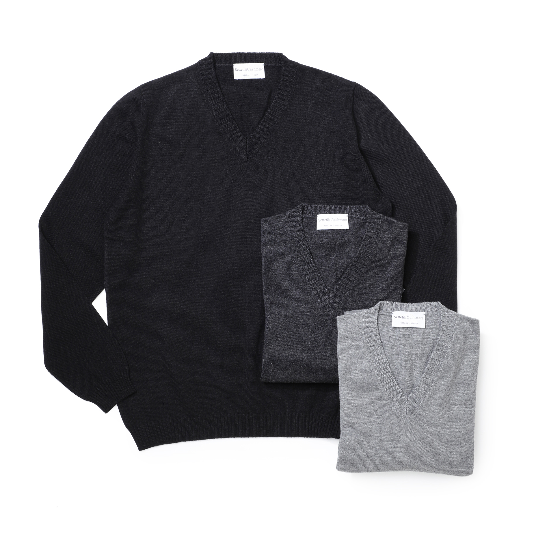 今年もやって参りました!BRでも大人気、そして僕も大好きなセッテフィーリカシミアのシルカシニットです!シルカシならではの、滑らかさ&ふんわり感の絶妙加減。この肌触りがとにかく気持ちよく、贅沢な着心地を味わえます。また、裾と袖のリブ幅が細いので軽快感のある雰囲気に。リブの締め付けは強過ぎず、裾がストンと下に落ちるのもポイント!Vネックの開き具合は、そこまで深過ぎないので、良い塩梅のセクシーさを醸します!白Tを覗かせるスタイルも個人的には好きですね〜。絶妙なリラックス感があるバランスのよさは、こだわって別注したからこそです!一枚で着ても良し、ジャケット、ライダース、コートのインナーでも◎僕はTシャツに肩掛けニットをする際にも頻繁に使用していて、なんだかんだ年中愛用しています。笑