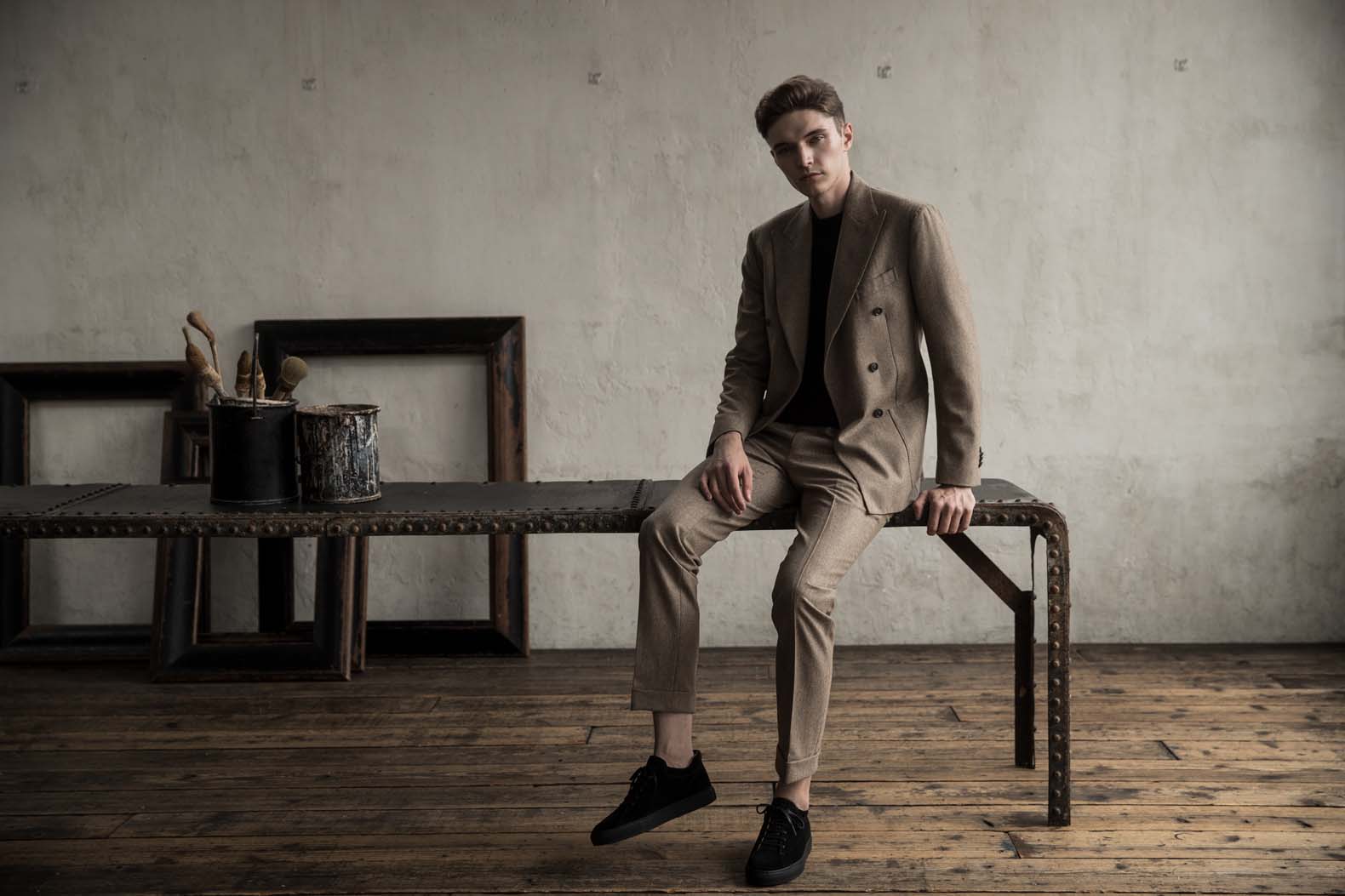 個人的にはラグカジスタイルとして着用したいこちらのスーツ。インナーにはクルーネックニットに白Tチラ見せ、足元はスニーカーですね!ジャケットはダブルブレステッドでありながら、フランネル生地且つパッチポケット仕様なので、絶妙なカジュアルダウンがハマるスーツなのです!柔らかなフランネル生地は、季節感あり、ベージュという色味が上品且つ洒落て見えるでしょう!ちなみに、ジャケット単品使いも◎