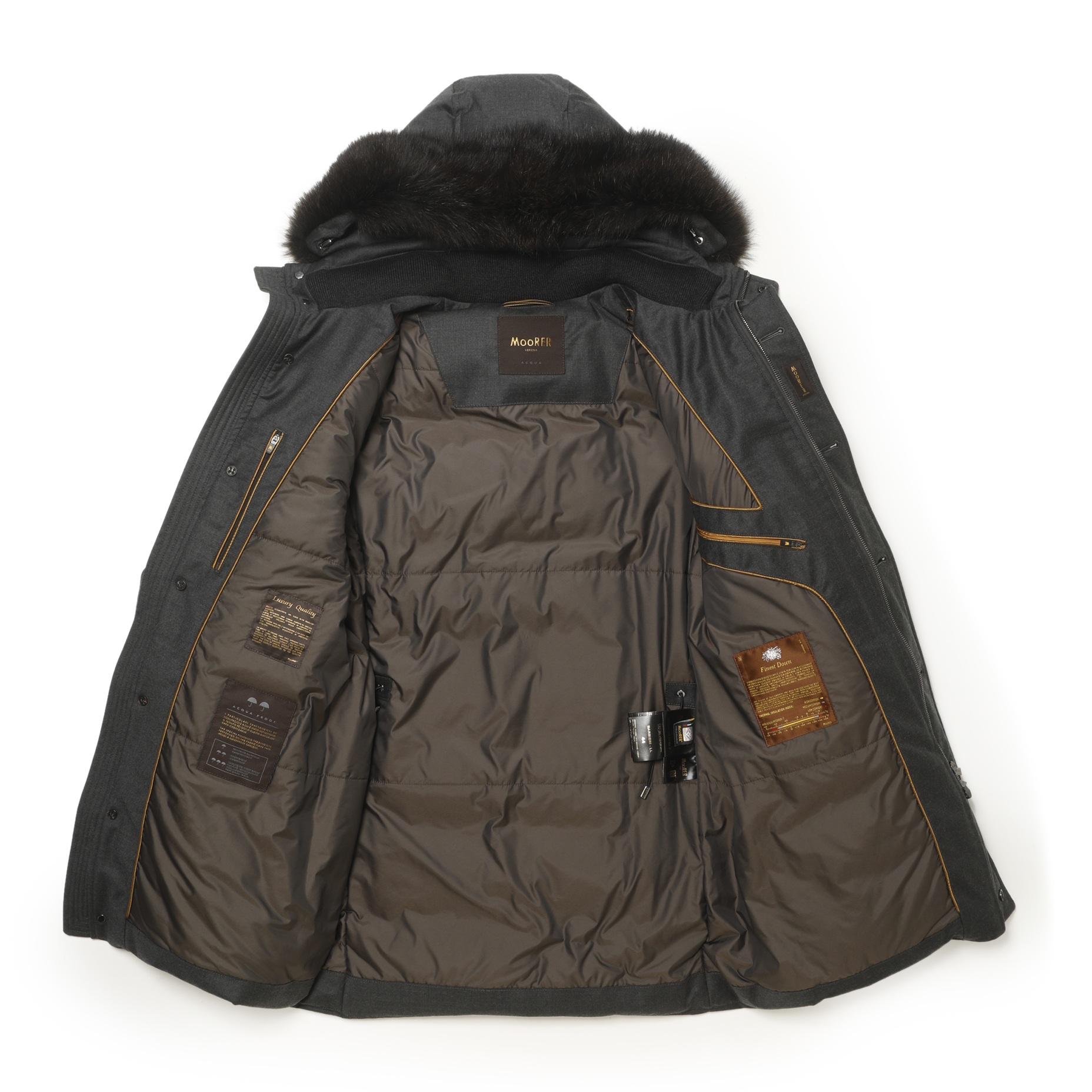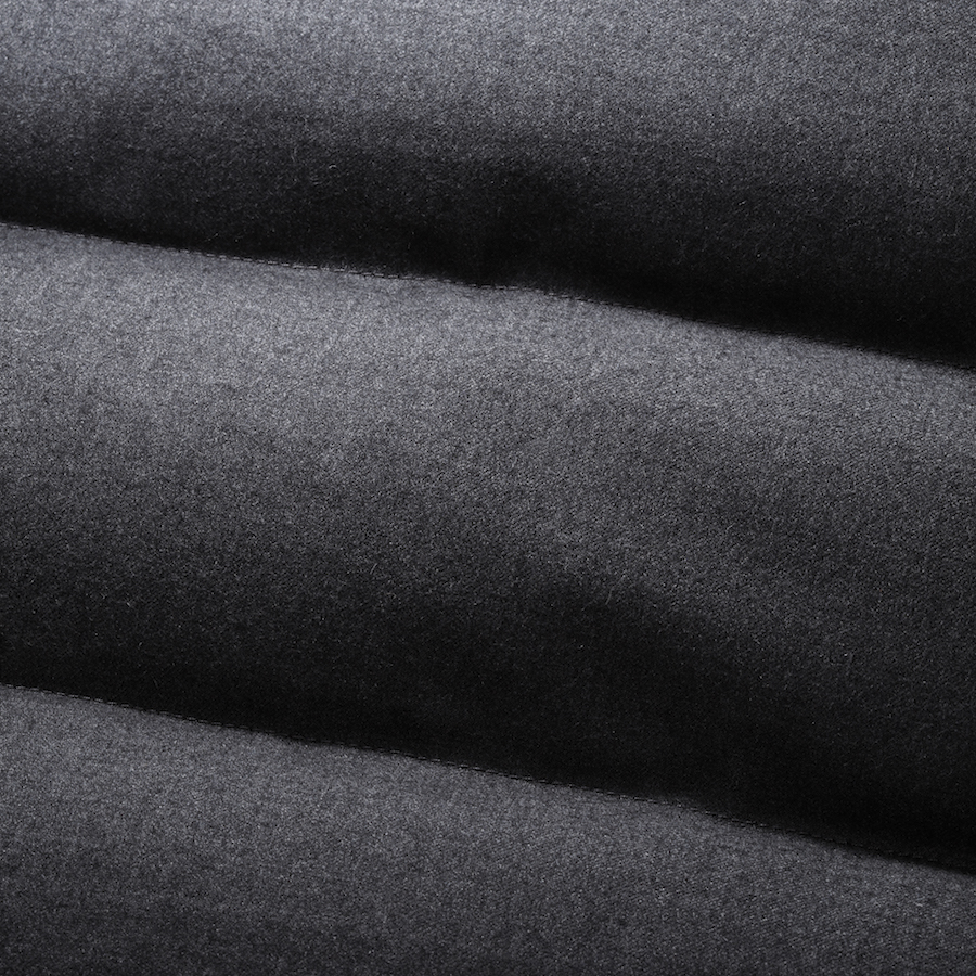 ・ダウンコートながらこれぞ「MooRER(ムーレー)」と言わしめる上品さを醸すシェルも印象的。カシミアが5%ブレンドされたウール&カシミアです。それゆえの微光沢感が品の良さの秘密。また組成のポリウレタン5%は裏面に貼られた撥水フィルムのこと。つまり防水性も備えているのです。