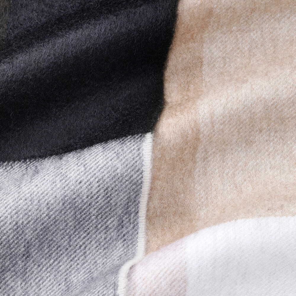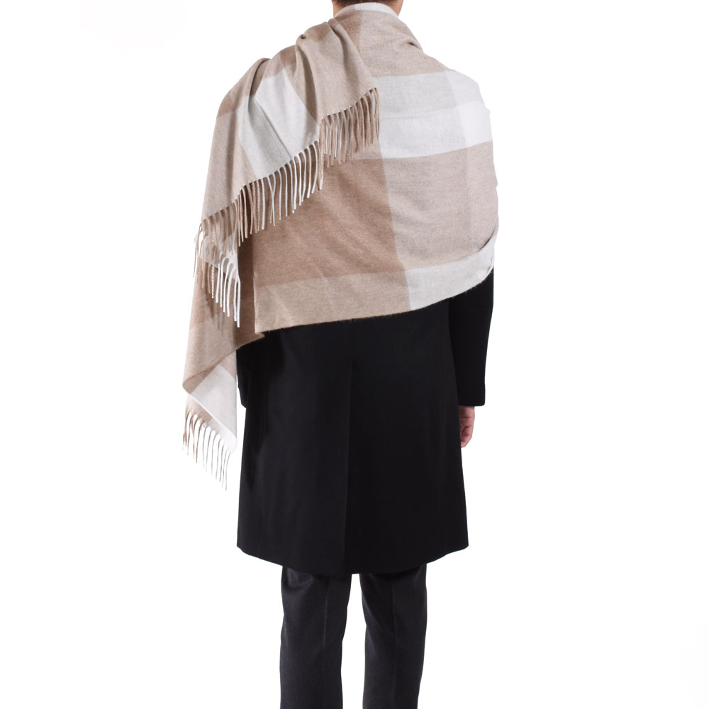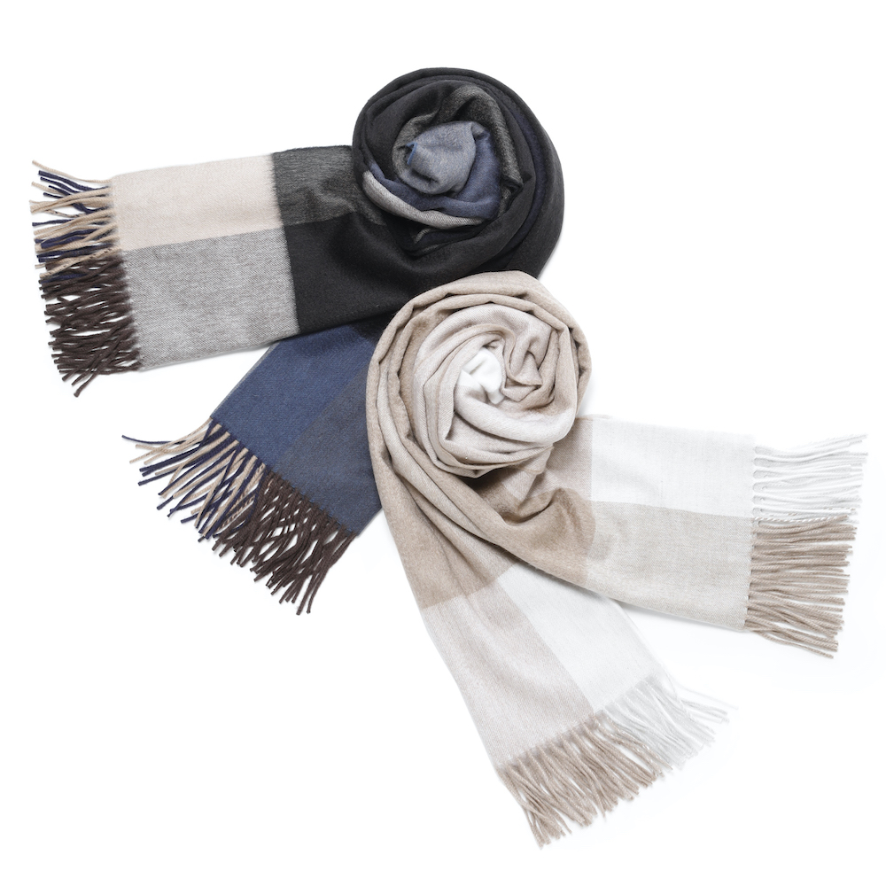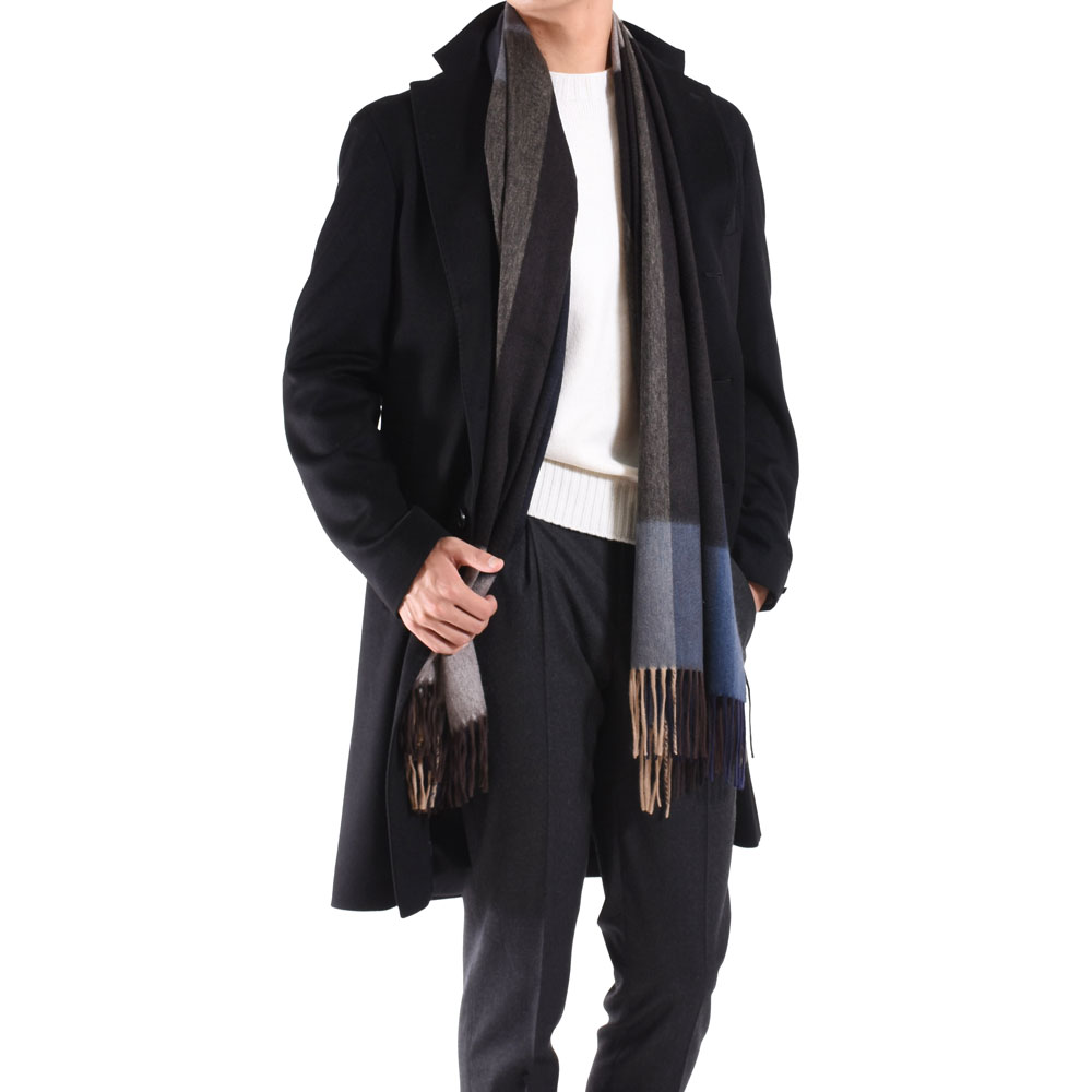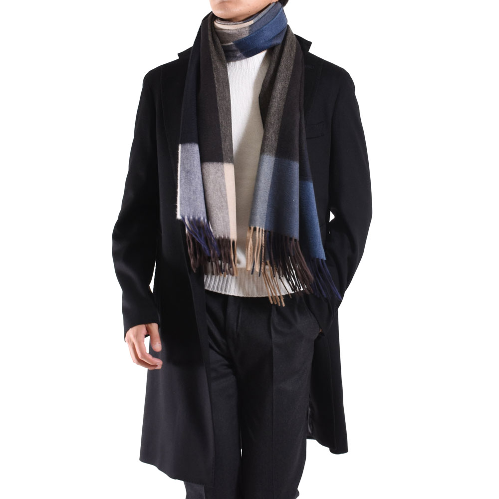 ・大判のカシミアストールというだけでかなり贅沢ですが、チェックの配色にご注目を。ベーシックカラーを使いながらも配置や組み合わせによって実にモダンに仕上げられた一枚。ただ巻くだけで嫌味なく洒脱な雰囲気を醸せます。