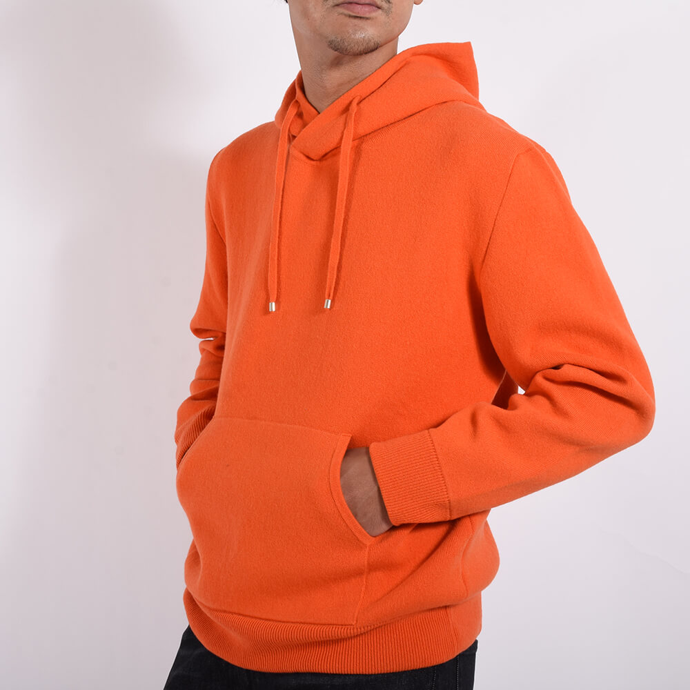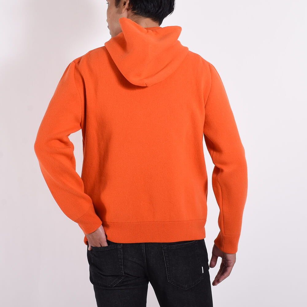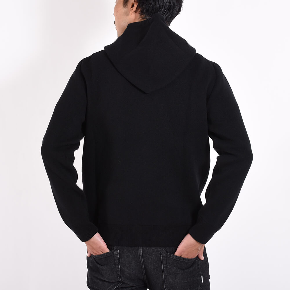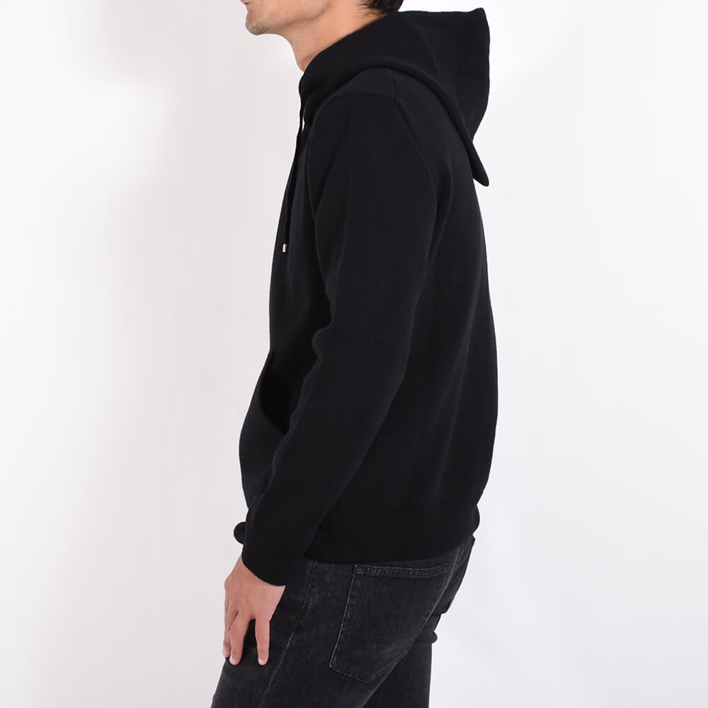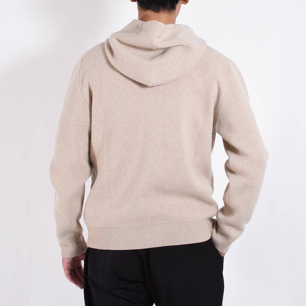 ・カシミアニットらしさを出しながら、ほどよくゆったりとしたシルエット、フードのボリューム感を実現するためには肉感のある編み地が必要、ということで新しく編み地を開発。スムース編みを採用し、肉感と伸縮性を両立。さらに編み上げた後に適度な洗い加工を施すことでカシミアらしいフワッとした質感も出しました。