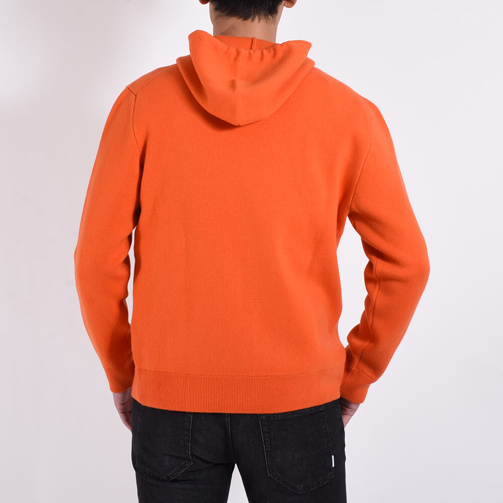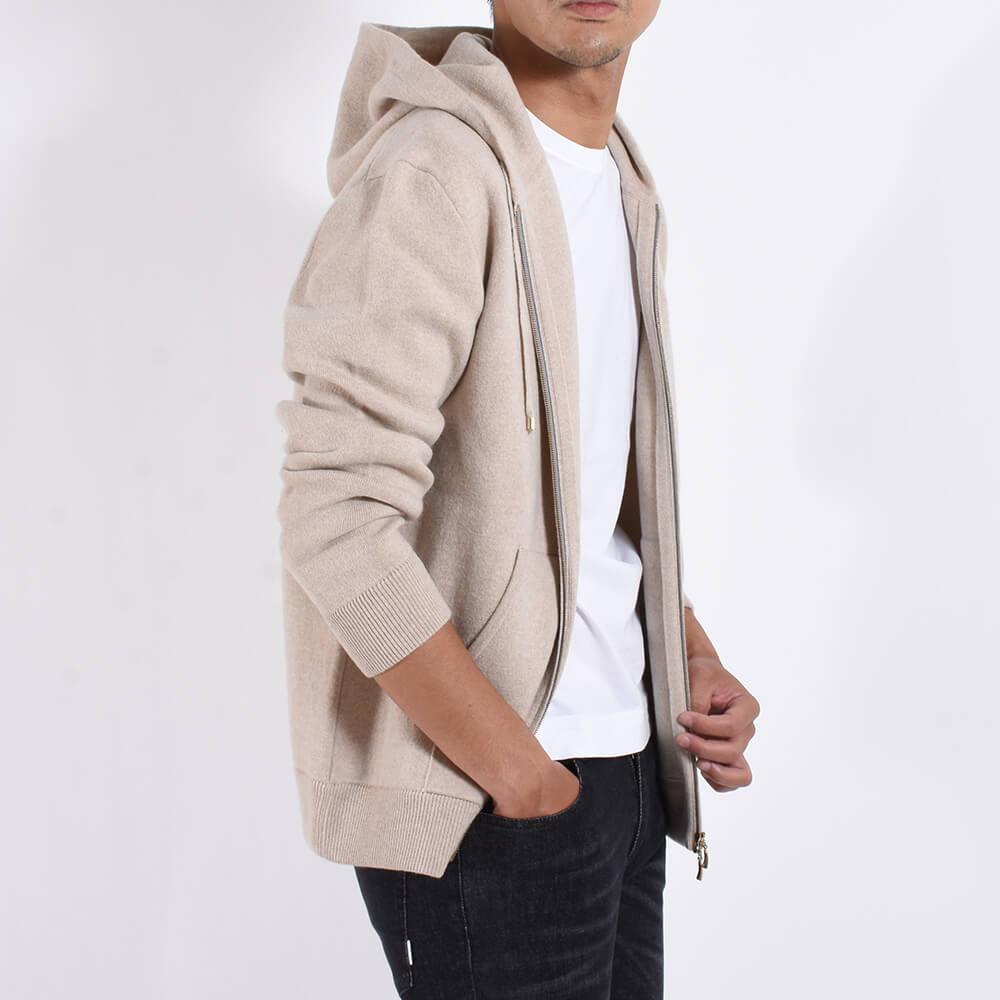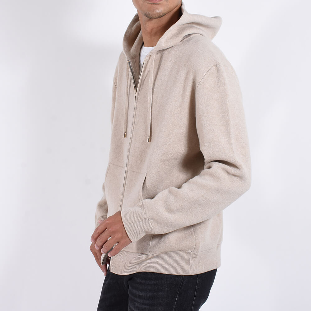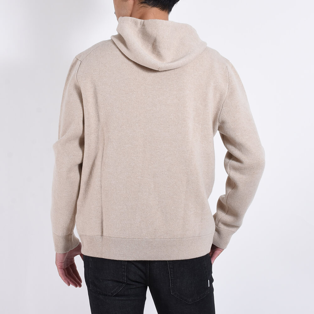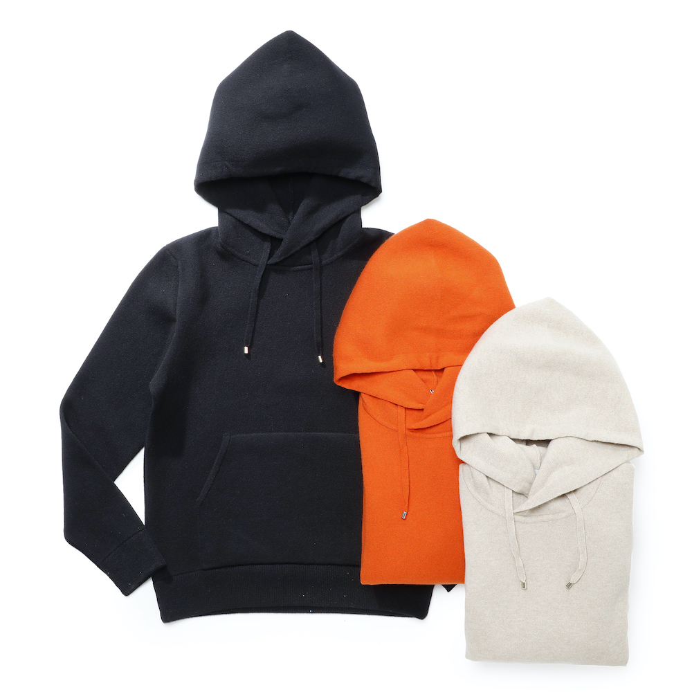 ・カシミアニットらしさを出しながら、ほどよくゆったりとしたシルエット、フードのボリューム感を実現するためには肉感のある編み地が必要、ということで新しく編み地を開発。スムース編みを採用し、肉感と伸縮性を両立。さらに編み上げた後に適度な洗い加工を施すことでカシミアらしいフワッとした質感も出しました。