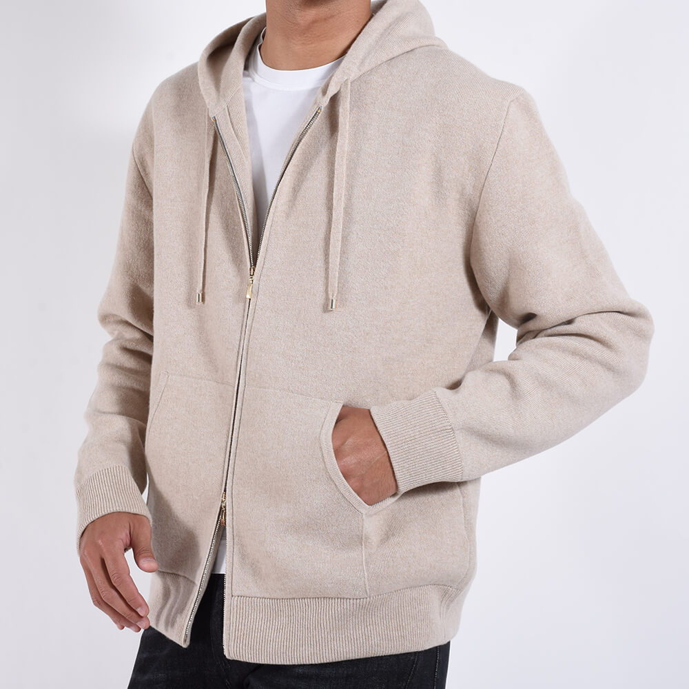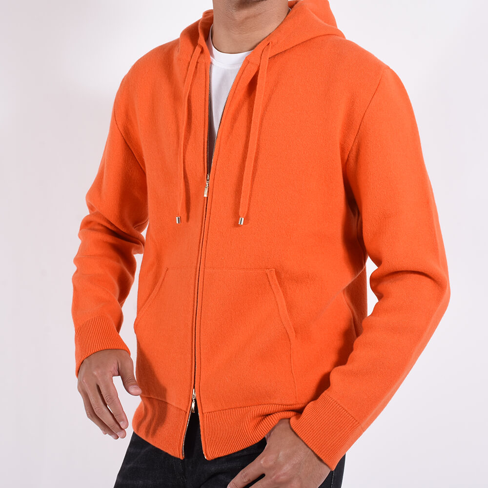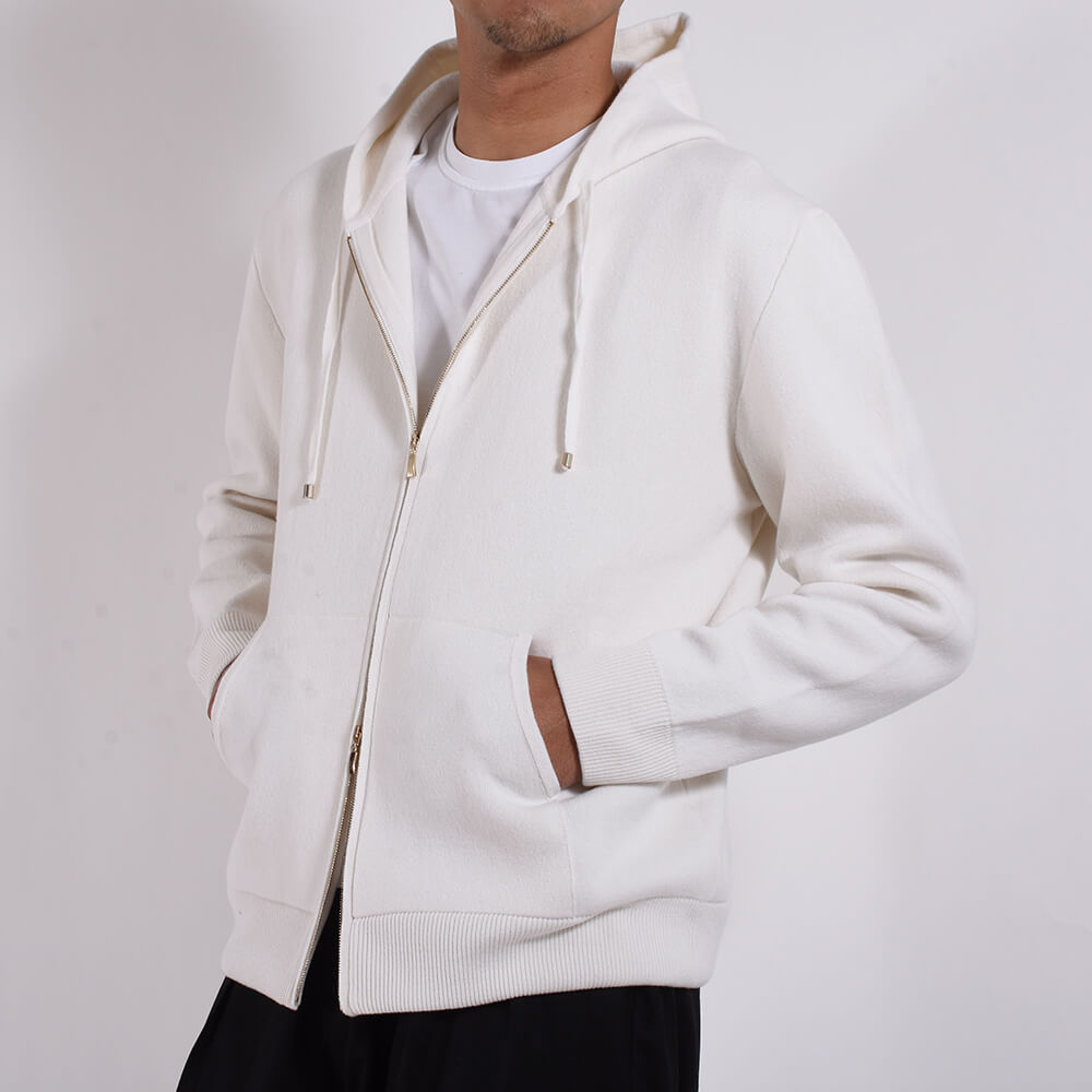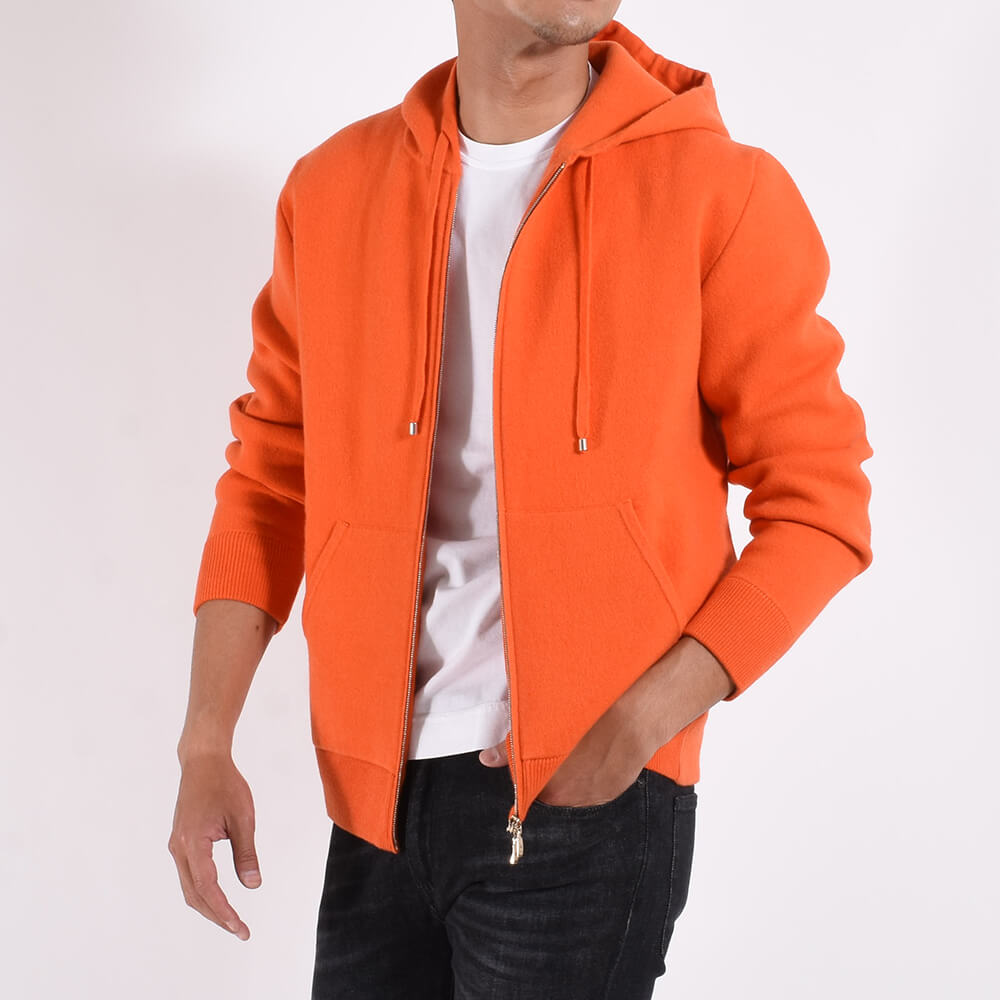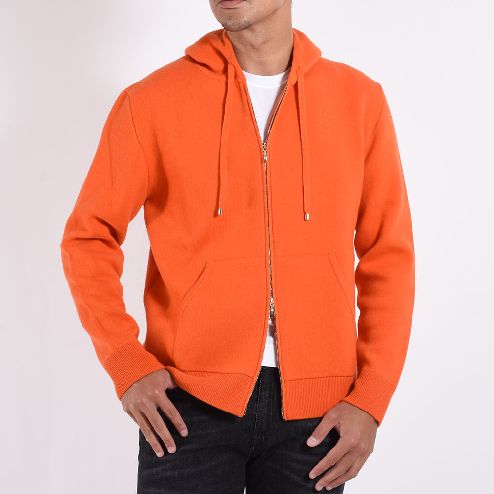 ・カシミアニットらしさを出しながら、ほどよくゆったりとしたシルエット、フードのボリューム感を実現するためには肉感のある編み地が必要、ということで新しく編み地を開発。スムース編みを採用し、肉感と伸縮性を両立。さらに編み上げた後に適度な洗い加工を施すことでカシミアらしいフワッとした質感も出しました。