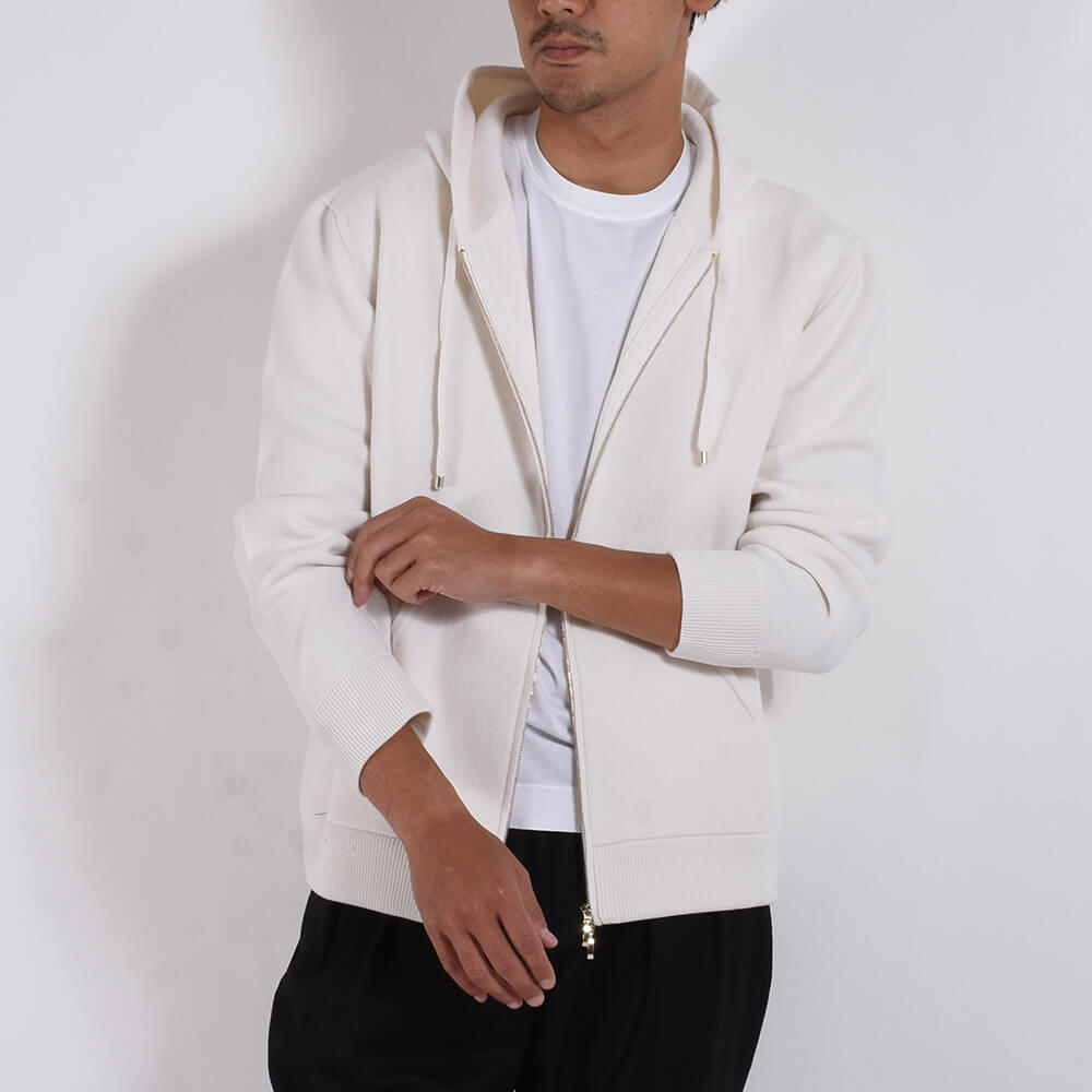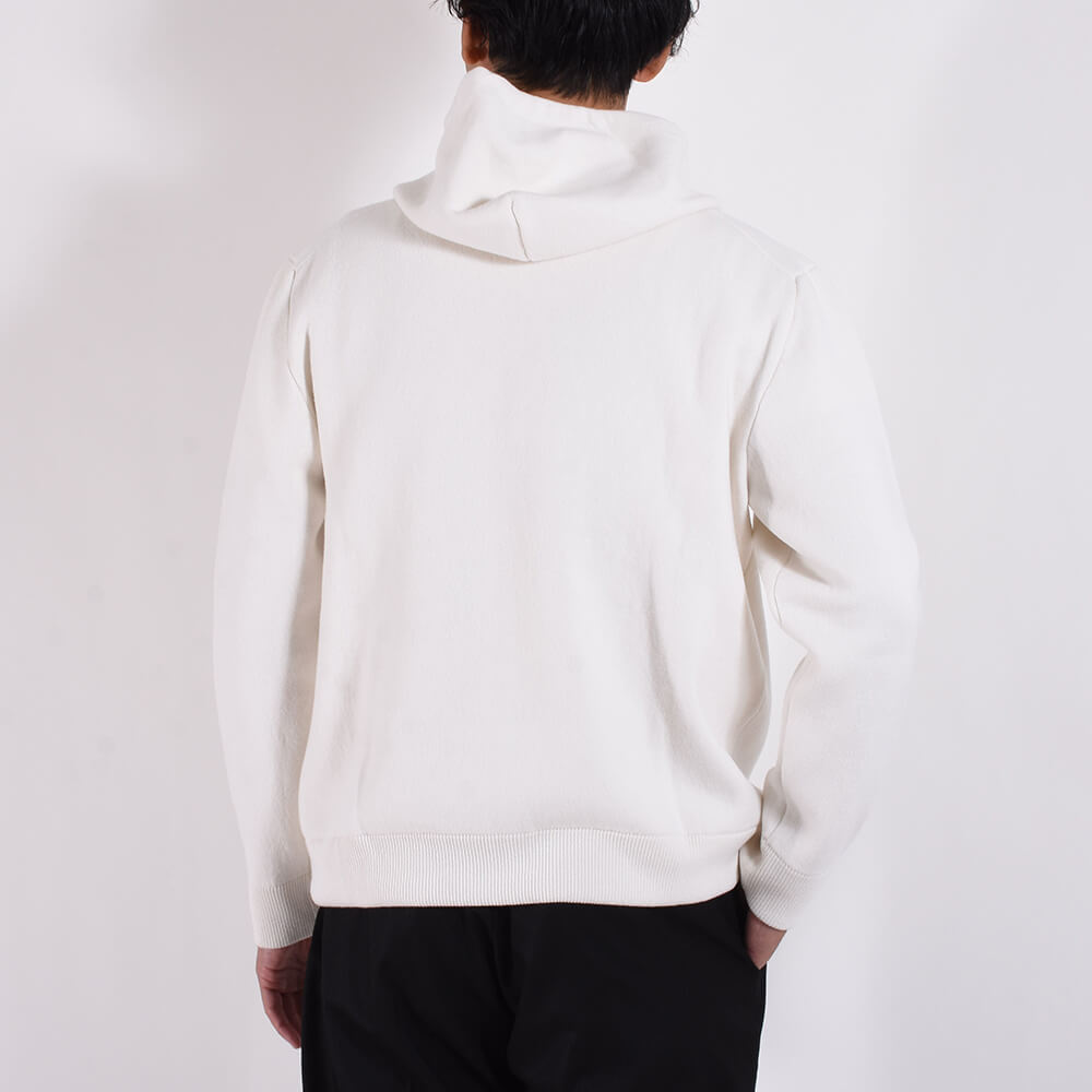 ・さまざまなブランドがリリースしているものの、これほどフードが立つニットパーカーは見当たらないはず。この立ち具合を実現するために、フードの大きさから編み地に至るまで徹底的にこだわりました。