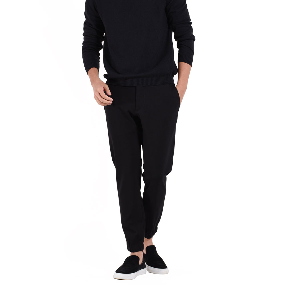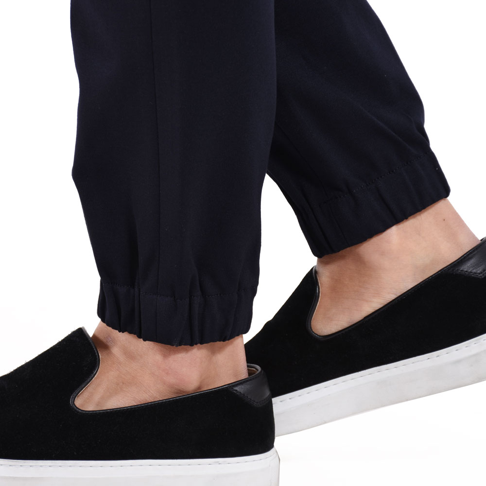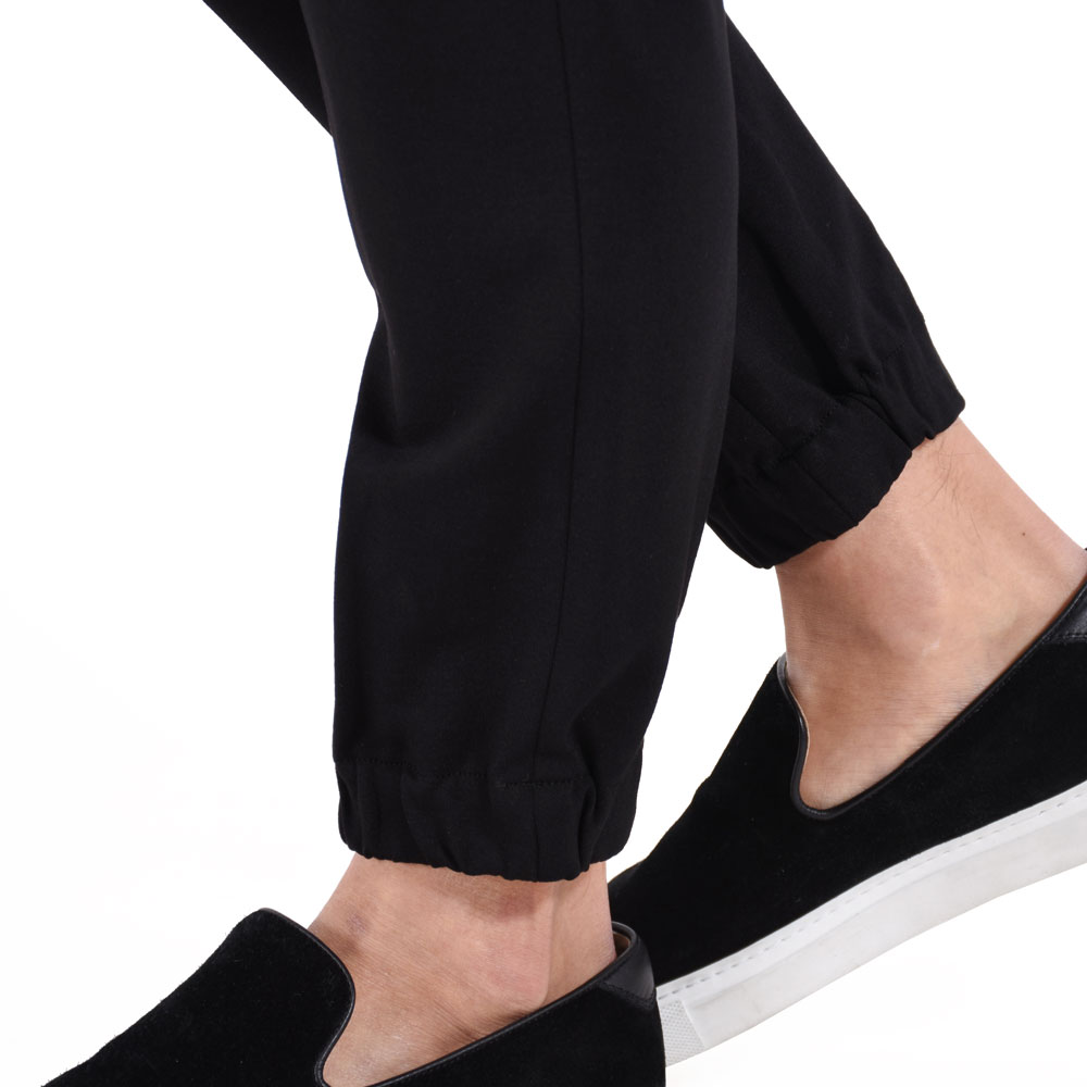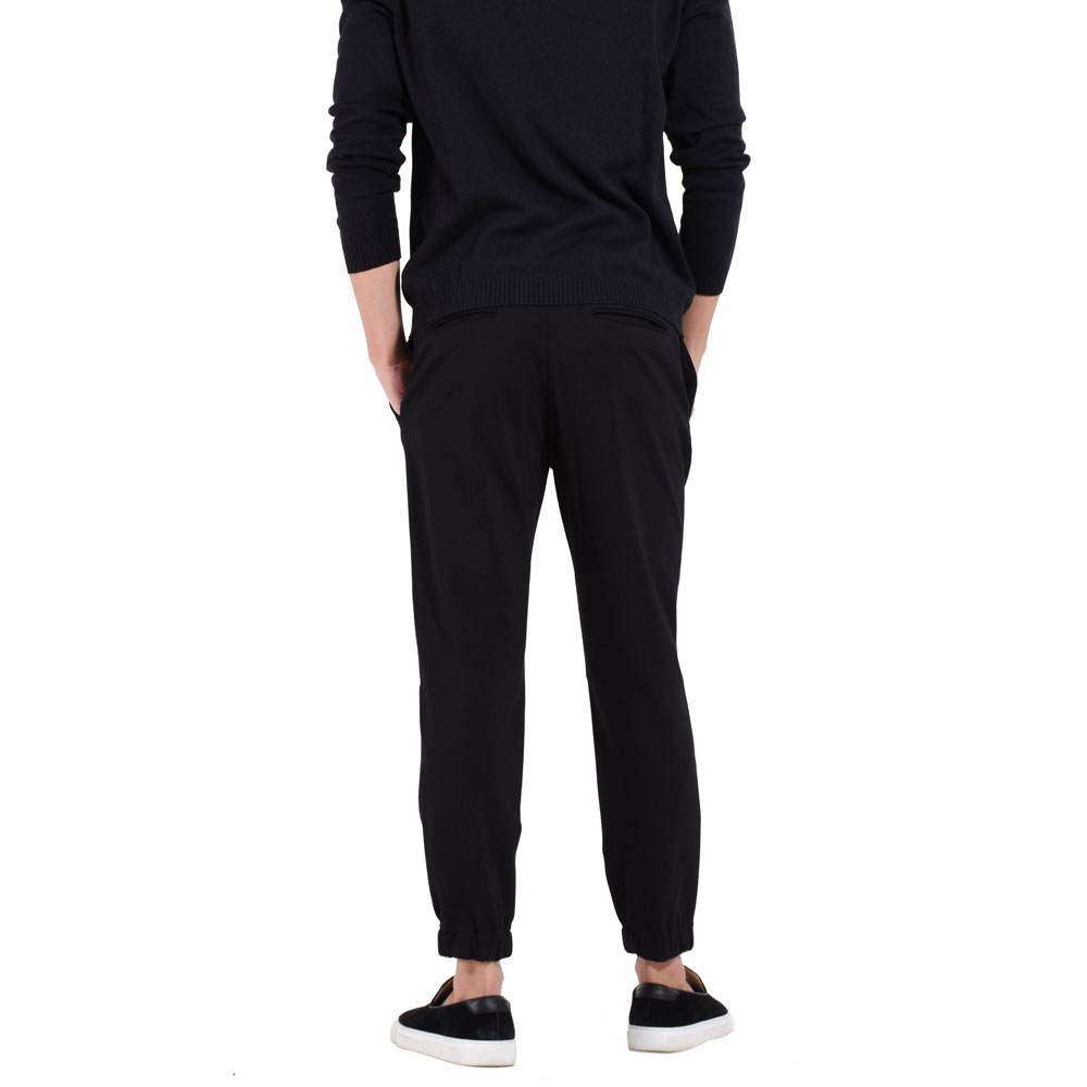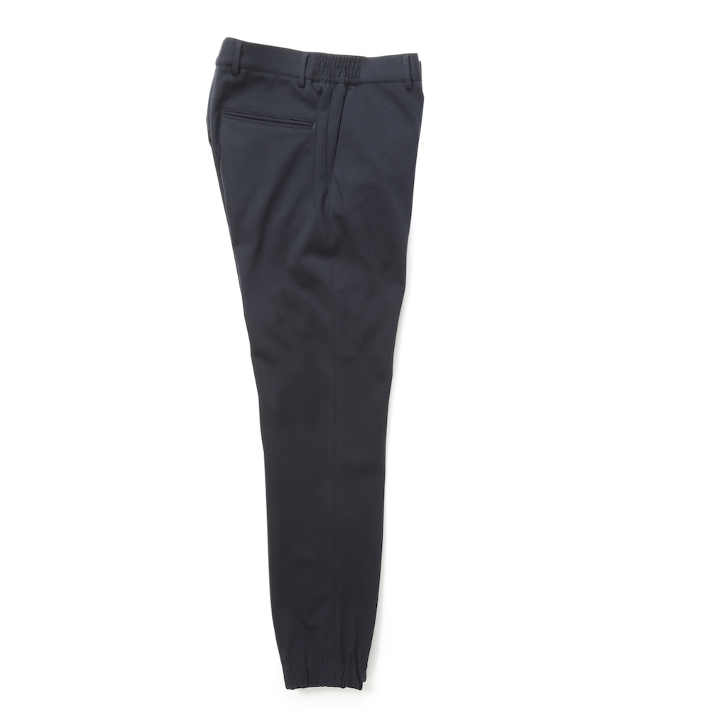 ・シルエットはスリムテーパードで裾がゴムシャーリング仕様となっていることでスポーツテイストが加速!ワタリ、膝、裾にかけてなだらかにかつ確実にテーパードしていくシルエットは「giabsarchivio(ジャブスアルキヴィオ)」ならでは。モードかつスポーティ。