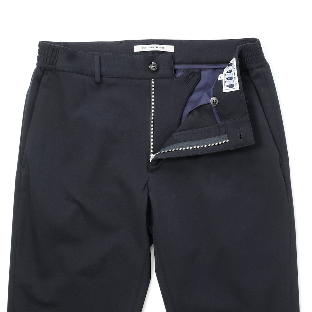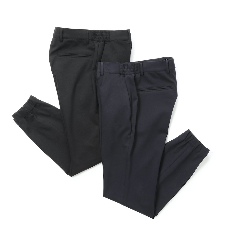 ・ジャージーゆえもちろん伸縮性は抜群!また、膝が出づらくシャープなシルエットをきちんとキープします。ほぼ通年着用可能な厚みと素材感も今の時代に適しています。