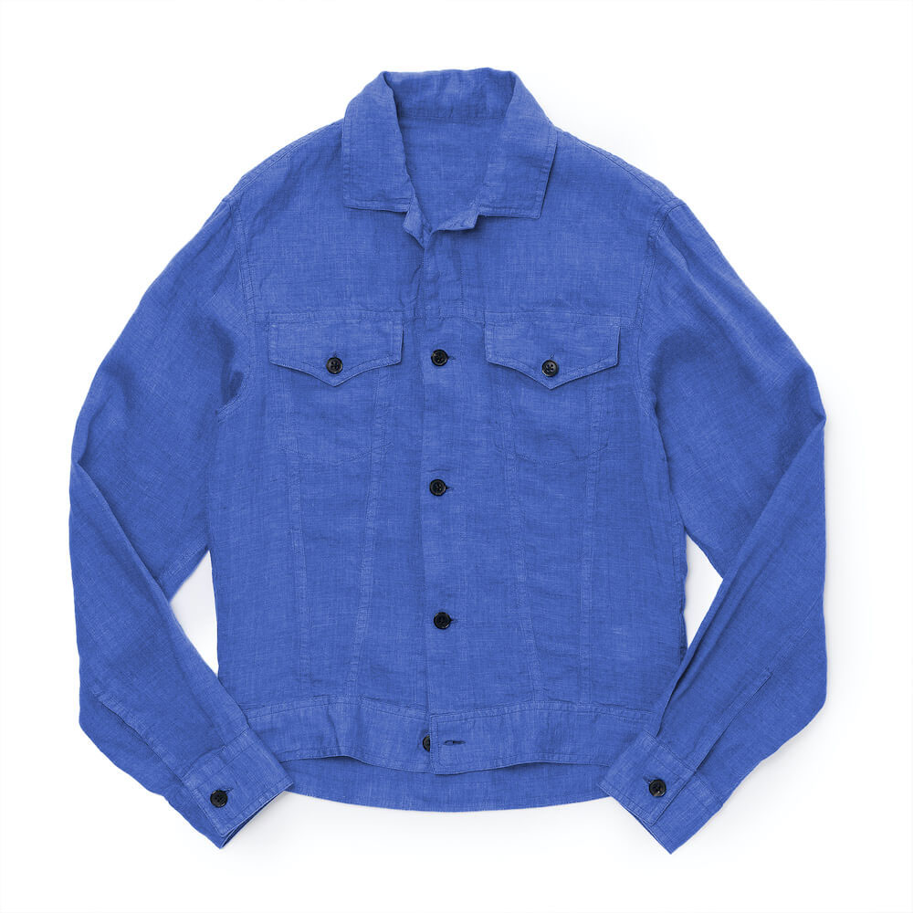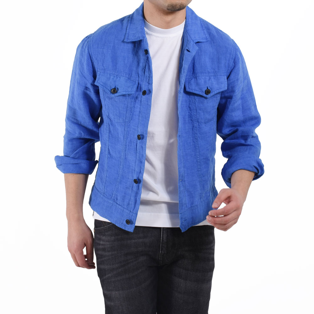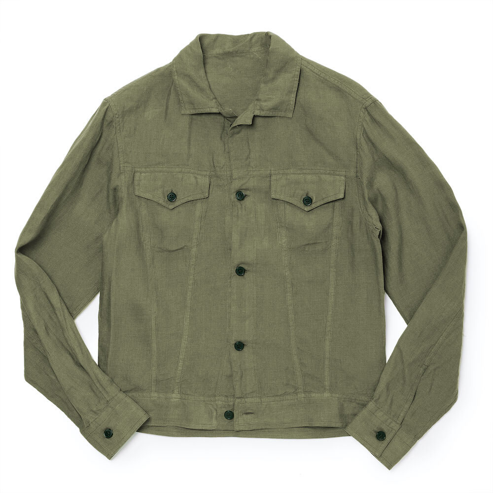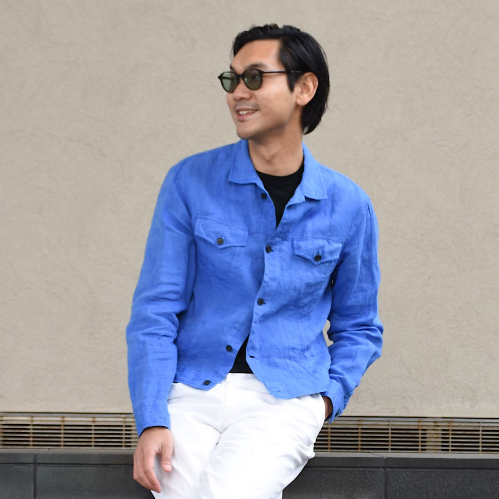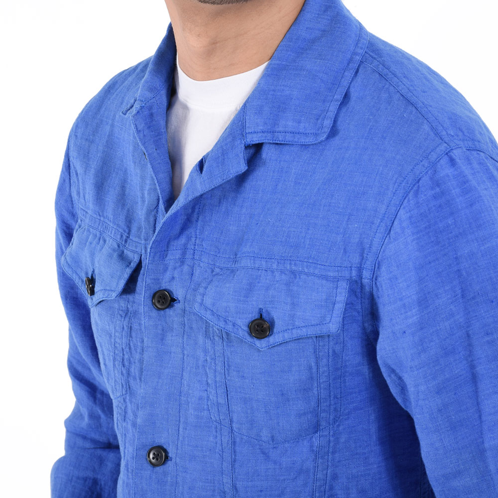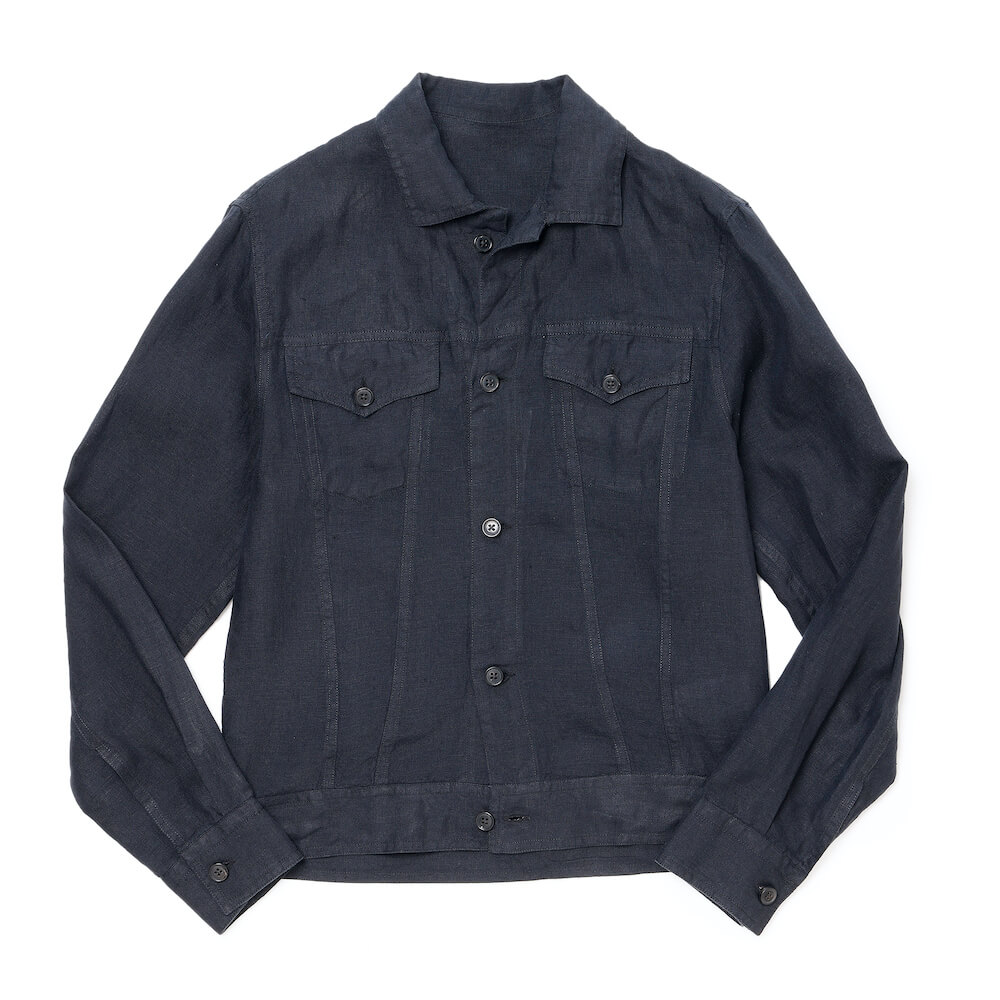 ・いわゆる3rdタイプのGジャン(トラッカージャケット)をモチーフとしており、生地はクリーン且つこなれ感のあるリネン。洗いが掛けられているため馴染みが良く快適な着心地です。シャツ生地ゆえ室内で違和感がないのも今の時代にピッタリ。