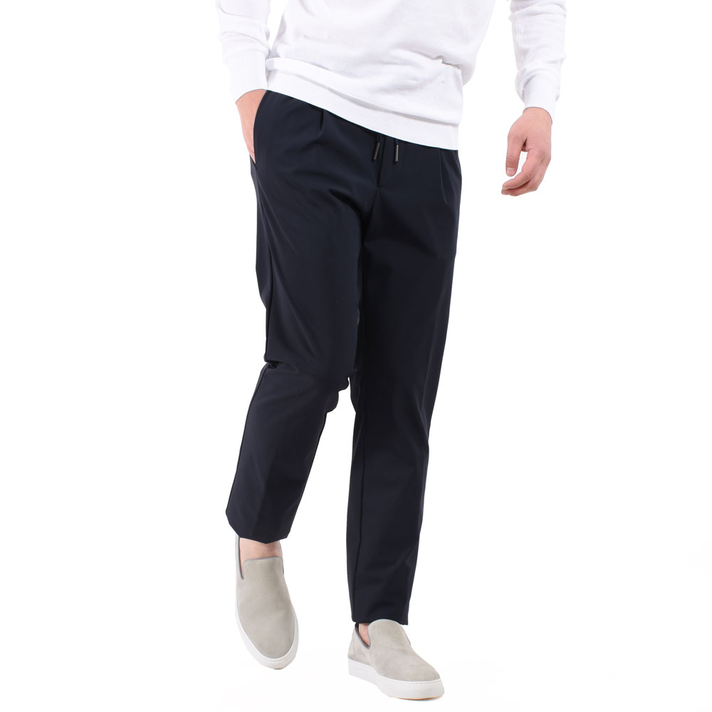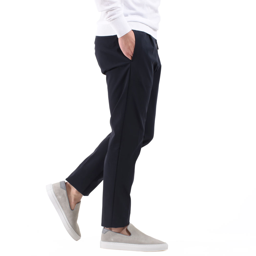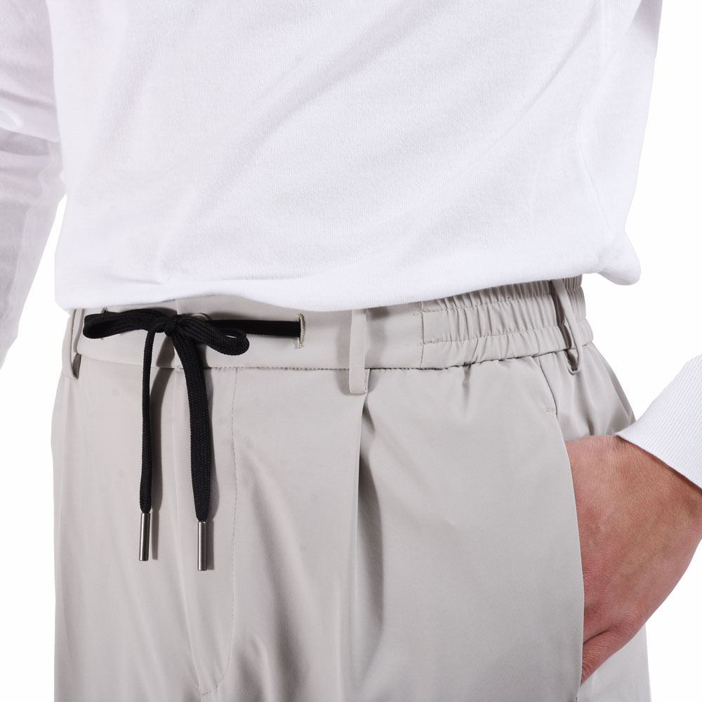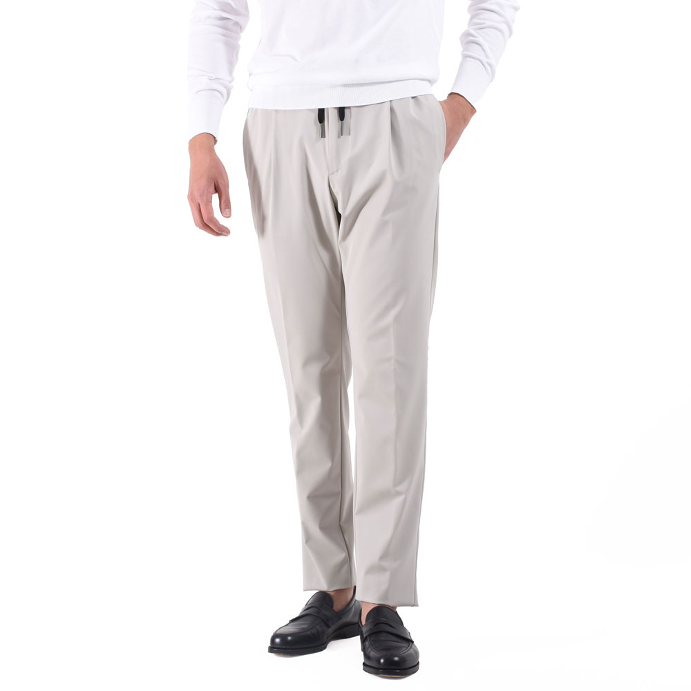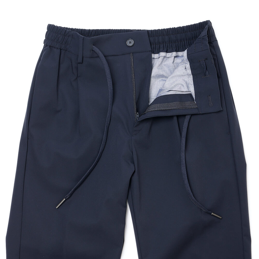 ・「TAGLIATORE(タリアトーレ)」のウエストシャーリンゴム&ドローコード付きのリラックスパンツは1プリーツ。腰廻りとワタリはほんのりゆとりがありつつも、美しくテーパードしたシルエットによってスッキリとした印象を与えます。