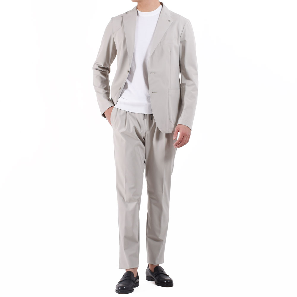 ・もはや定番となったスポーティな生地を使ったセットアップスーツ。「TAGLIATORE(タリアトーレ)」が用意しているストレッチナイロン生地は、控えめな光沢感と適度な肉感によりさりげなく高級感が醸され、今の時流にピッタリです。