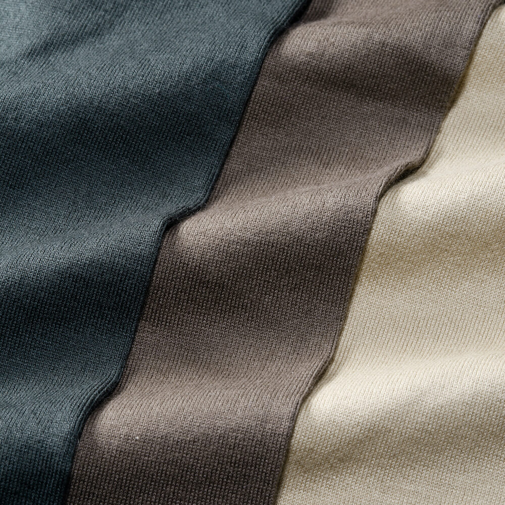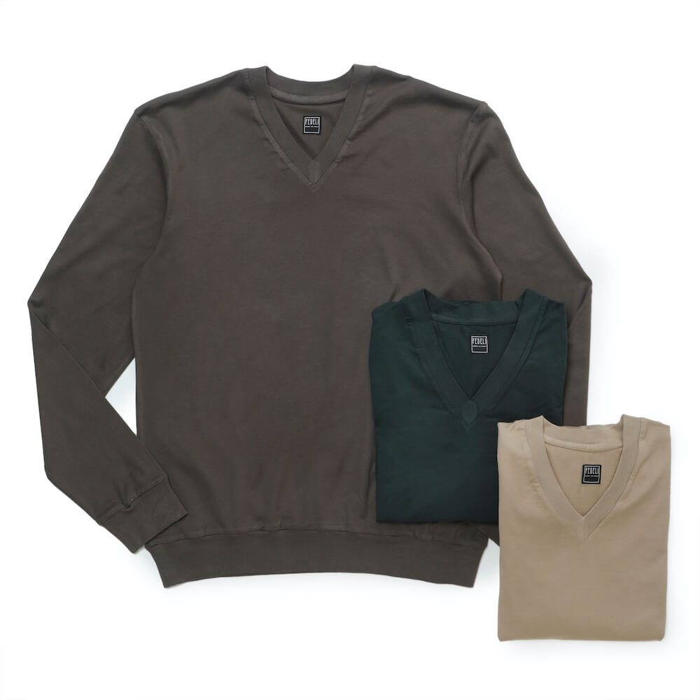 ・ご自宅での着用はもちろんのこと、そのまま外出しても見映えは十分。また、ジャケットやブルゾンのインナーにもピッタリ!長袖なので袖裏地が肌に触れることがなく、リブ付きなので袖や裾がジャケットやブルゾンから出過ぎてしまうということもありません。もちろんカットソーなのでイージーケアです。Vックの他、クルーネックとタートルネックもご用意しました。