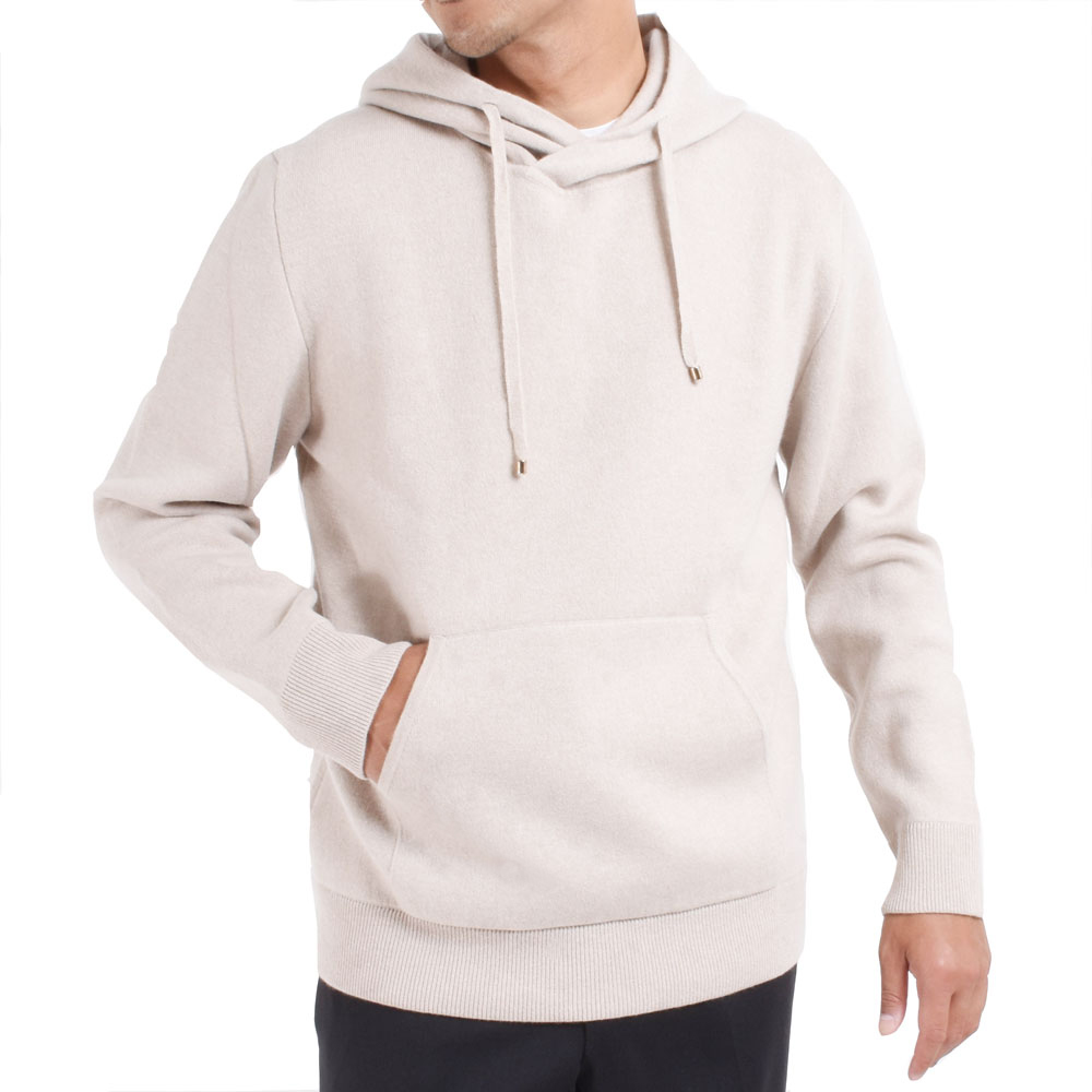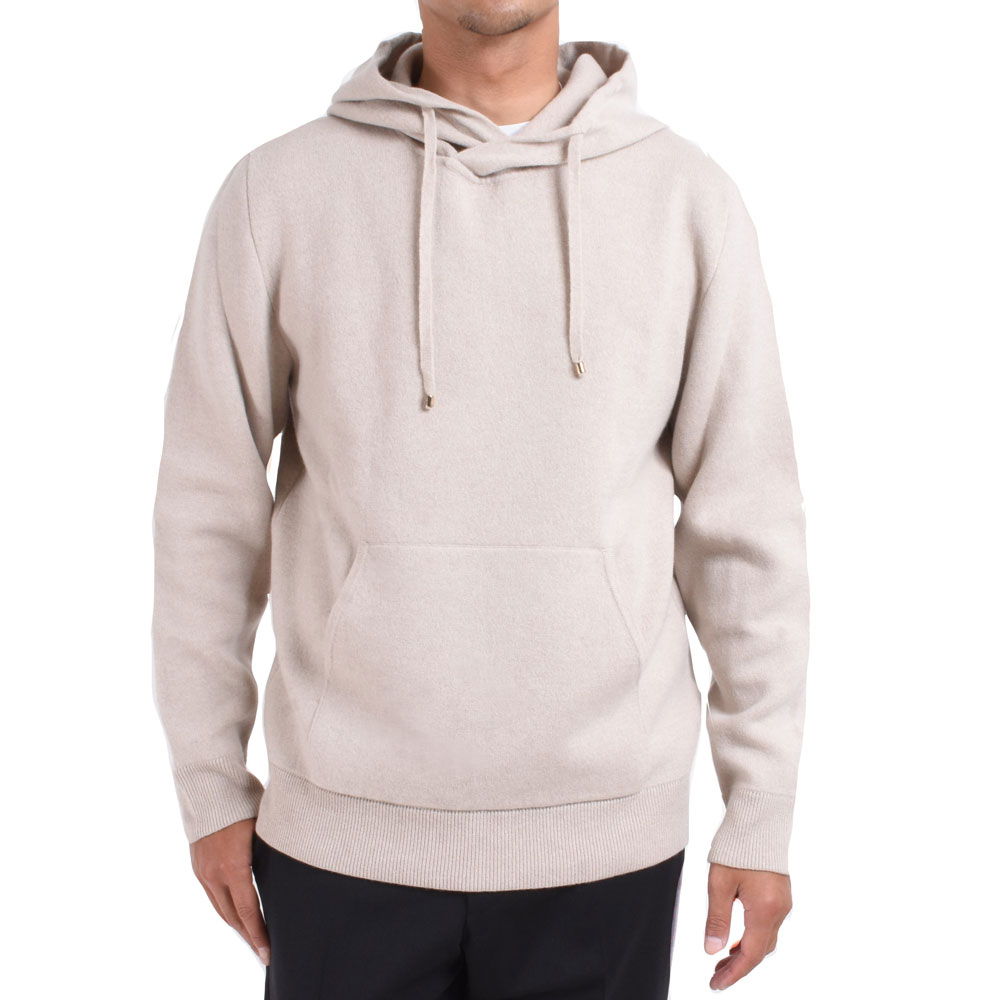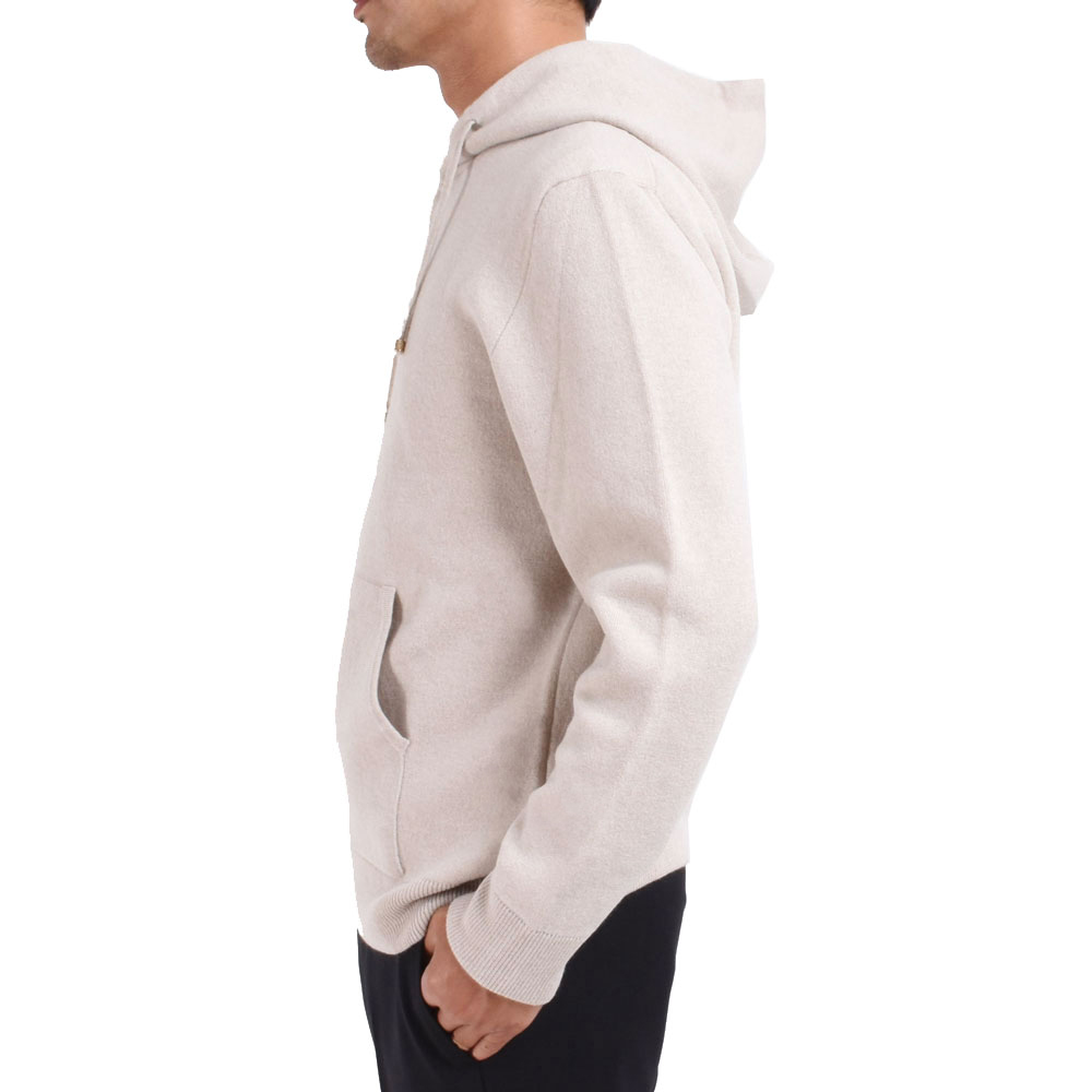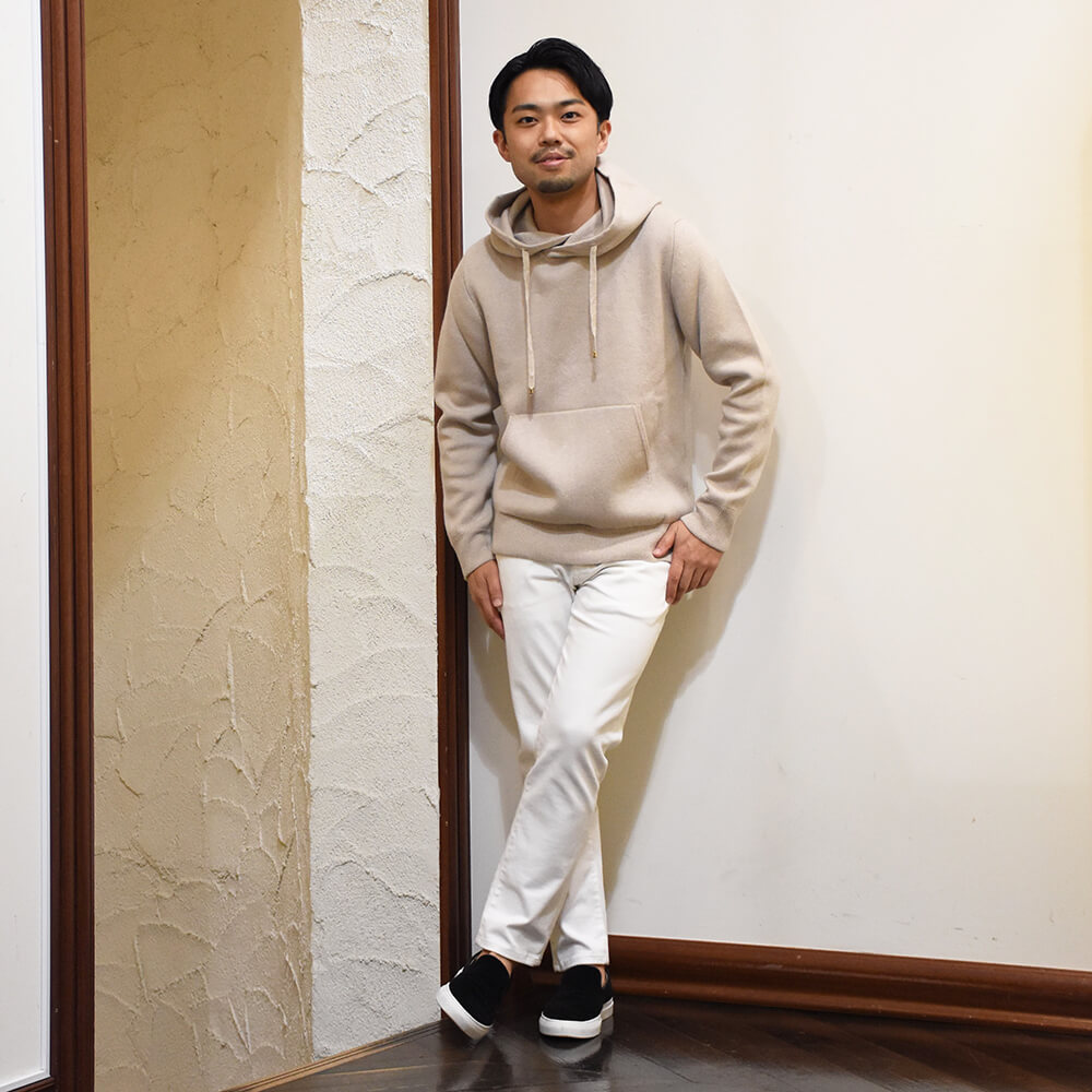 ・カシミアニットらしさを出しながら、ほどよくゆったりとしたシルエット、フードのボリューム感を実現するためスムース編みを採用し、肉感と伸縮性を両立。さらに編み上げた後に適度な洗い加工を施すことでカシミアらしいフワッとした質感も出しました。