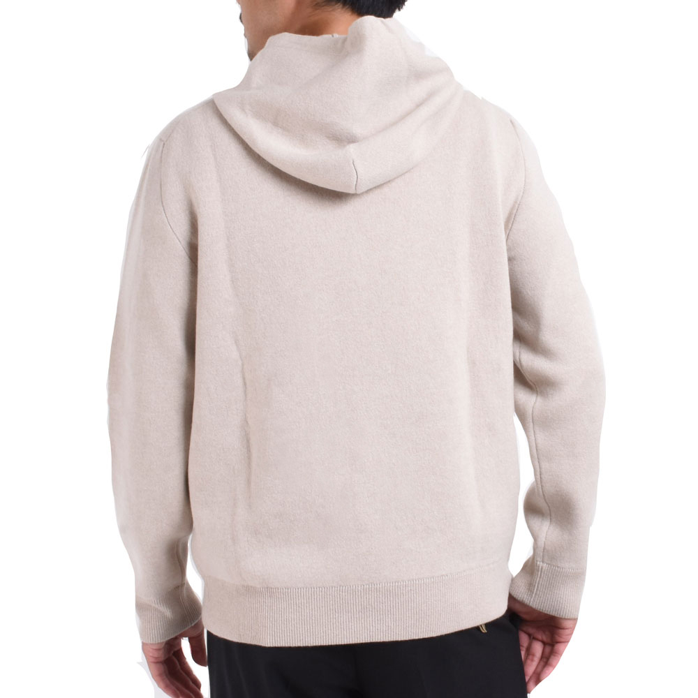 大好評アイテムが今シーズンも入荷しました!今やワードローブに欠かせない存在となったパーカー。ニットなので大人っぽく魅せられることに加え、カシミアを贅沢に使っているところが他のパーカーと一線を画す存在です。リラックスなのにどこか気を抜いていないラグジュアリーな雰囲気が堪りません!糸を2倍使用していることで保温性も抜群。シルエットは前・後ろ・横・から見ても適度なボリューム感と立体感もあり「只者ではないムード」が得られます。サイズ44を着用。袖や裾のリブのテンションも◎で丁度良いサイズ感でした。スッキリとしたサイズ感がお好みでしたらワンサイズダウンもお勧めです。