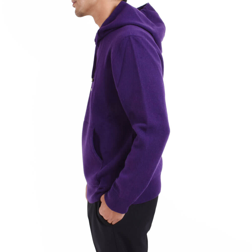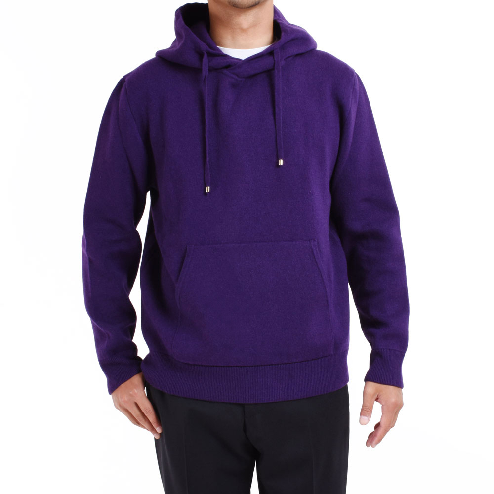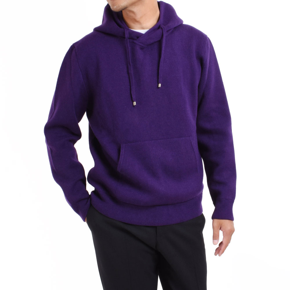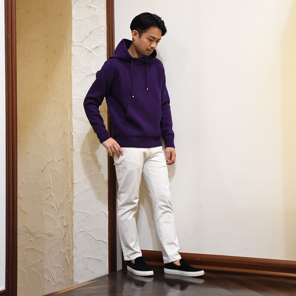 ・カシミアニットらしさを出しながら、ほどよくゆったりとしたシルエット、フードのボリューム感を実現するためスムース編みを採用し、肉感と伸縮性を両立。さらに編み上げた後に適度な洗い加工を施すことでカシミアらしいフワッとした質感も出しました。