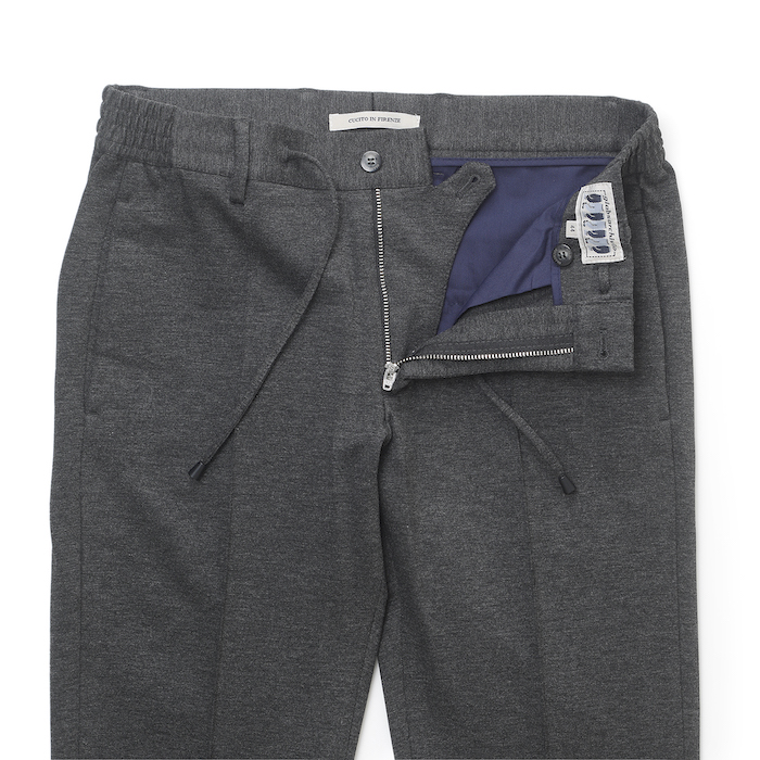 ・両サイドウエストの一部分がゴムシャーリングになることで腰廻りに沿う心地良いフィット感を実現しています。ベルトループが付属しているのは本格派トラウザースブランドの証。