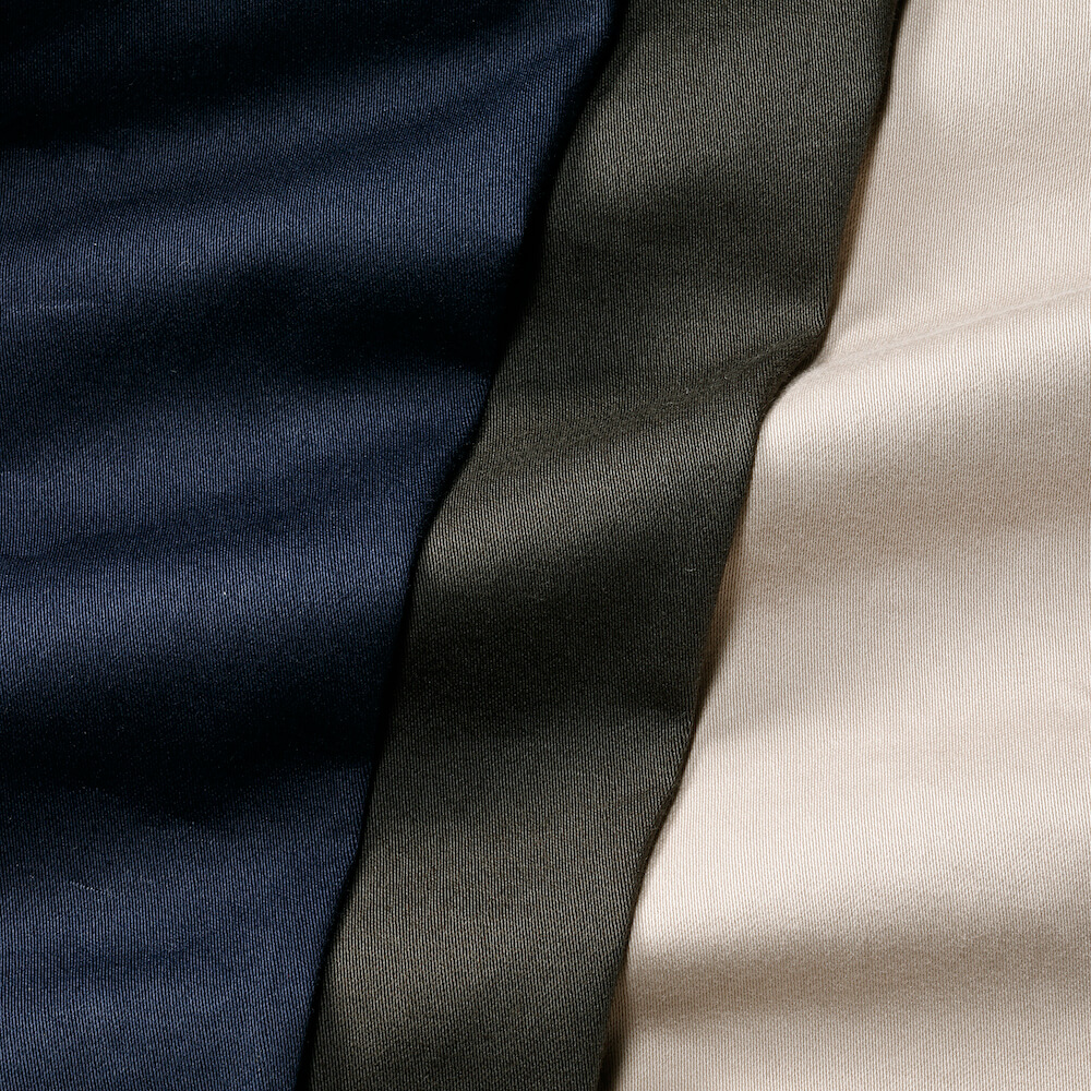 ・生地はしなやかで微光沢感のあるストレッチコットンサテン。柔らかなフィット感の腰廻りに仕上げられており穿き心地も抜群です。トップスをタックアウトした際に直に肌が触れても気になることはありません。裾は軽快なタタキ仕上げで、製品染めゆえのこなれ感が漂います。全3色をラインナップ。