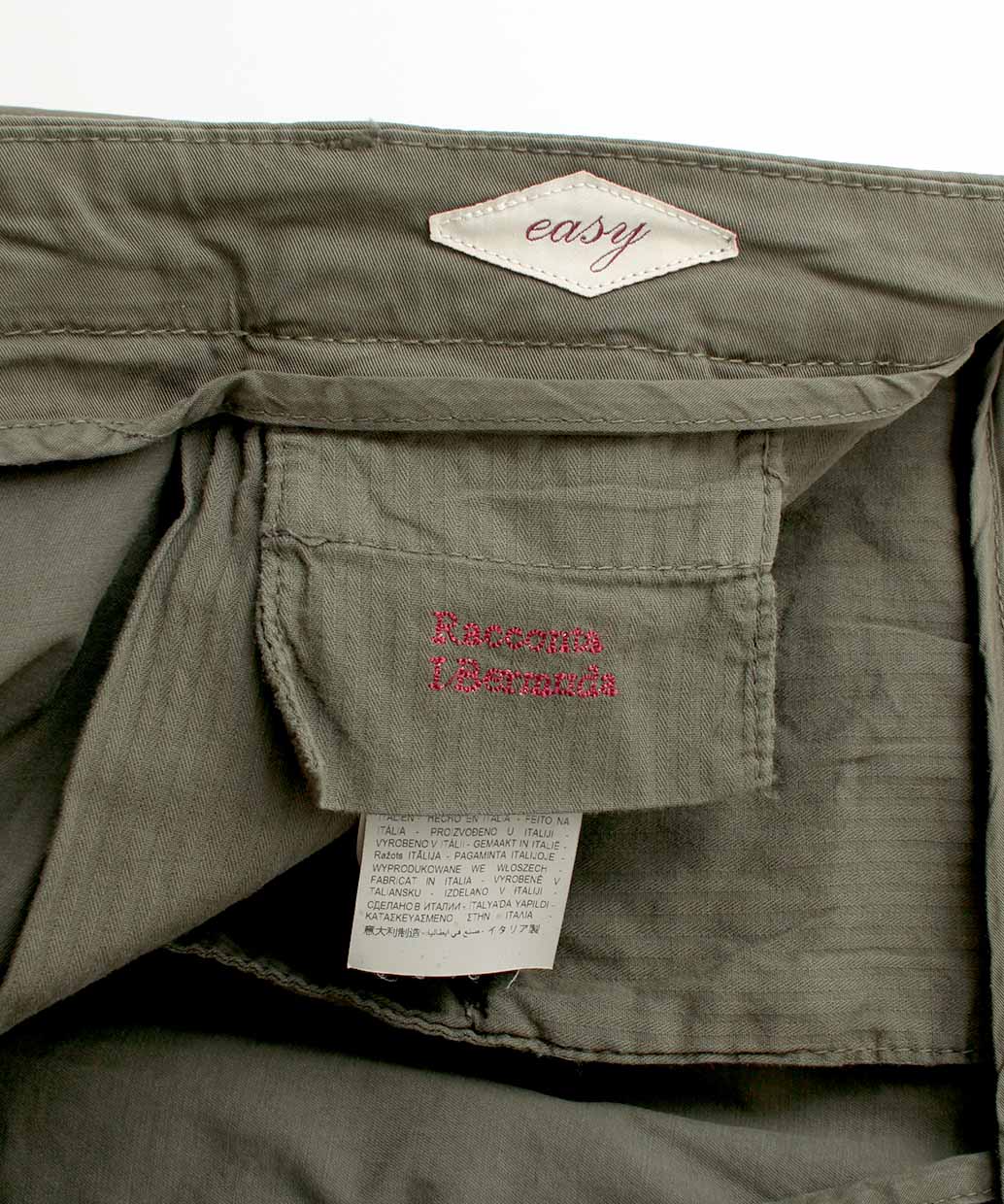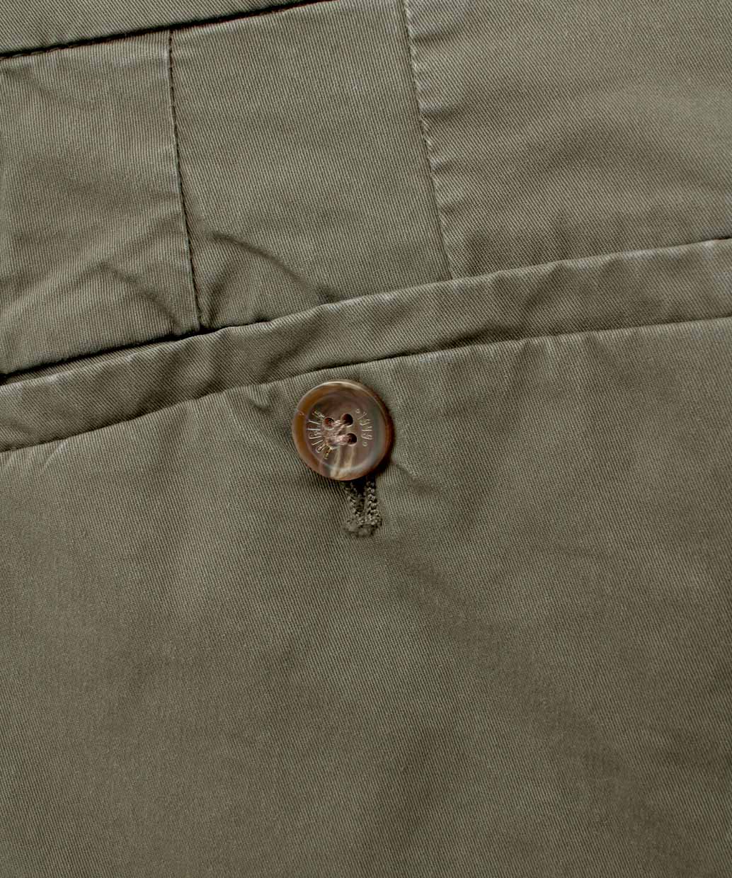 素材はコットンをベースにポリウレタンをブレンドし、上品な見た目と快適なストレッチ性を両立。ポケットは片玉縁でクリーンにまとめ、コインポケットを備えることで利便性も確保しました。さらにBRIGLIA刻印入りボタンが、さりげないクラス感を添えます。