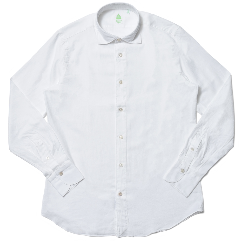 カジュアルラインは洗いのかかったナチュラルな風合いが特徴で、アームホール、ボタン、ガゼット部分は熟練した職人の手によるハンドメイド。ドレスラインはさらにハンドポイントが増え、ハンドメイドならではの柔らかな風合いとストレッチのような着心地が、90年以上の歴史を誇る老舗シャツメーカーフィナモレの大きな特徴です。