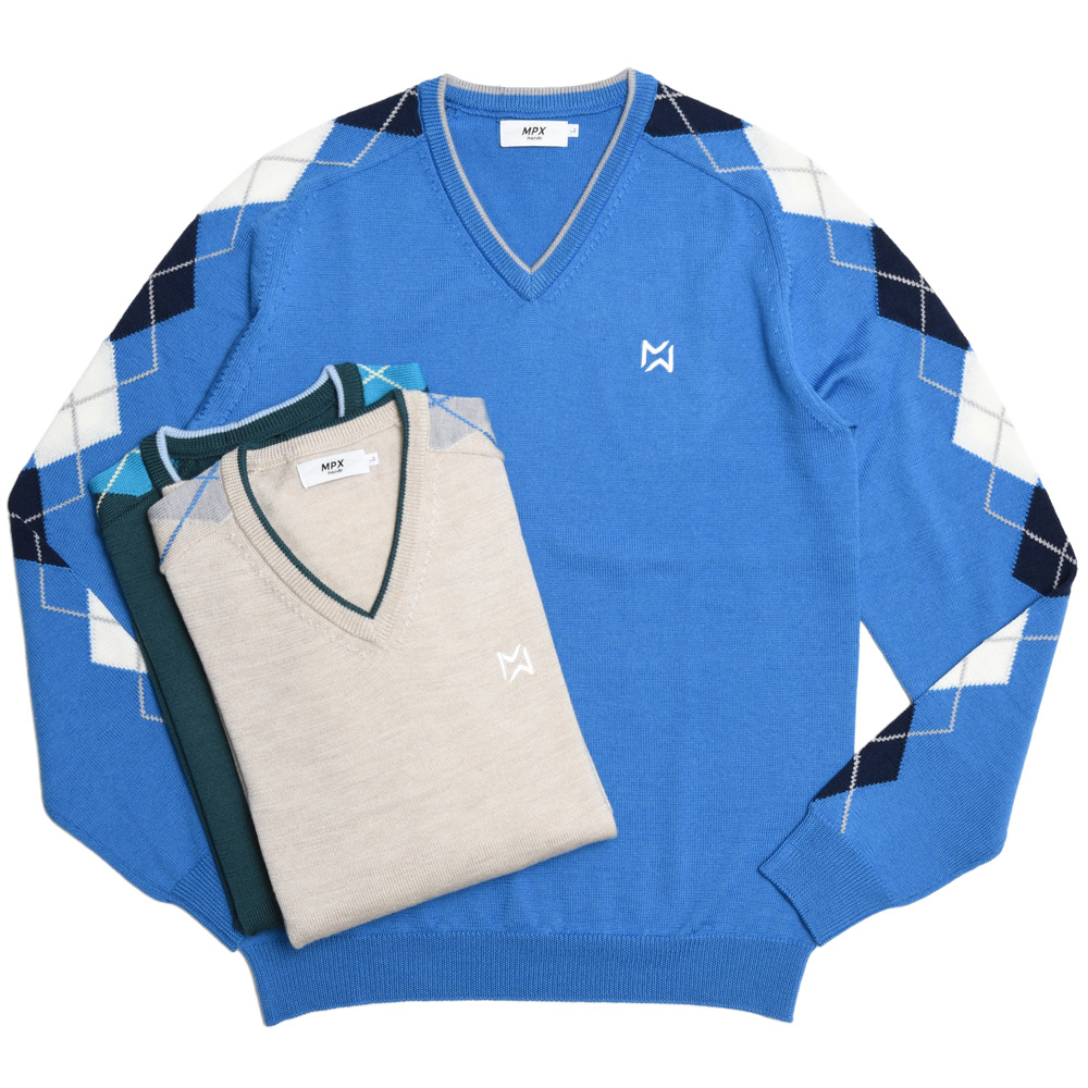 MPX mando GOLF(エムピーエックス マンド ゴルフ)ウォッシャブルハイゲージウールアーガイルスリーブVネックニット MPX2331-G01