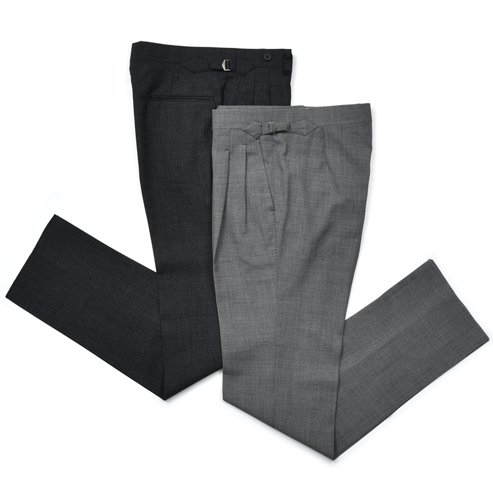 IGARASHI TROUSERS(五十嵐トラウザーズ)SUPER120'ウールトロピカルペンシルストライプ2プリーツサイドアジャスターテーパードパンツ IGT/2OUTP/CM80