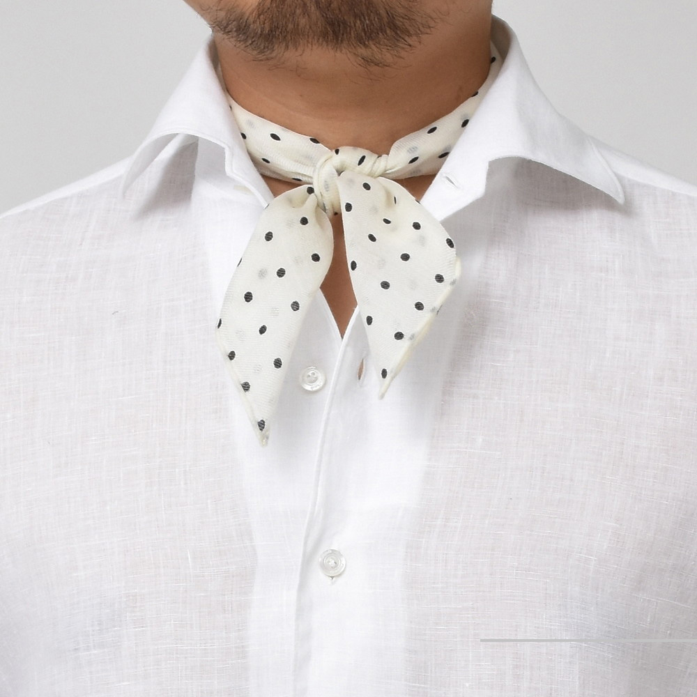 ドットのモチーフをポップにならず、上手くスタイリングにミックスするためには同色系の中にこっそり潜ませると良いと思いますので、色を合わせたシャツやニットと合わせ、ちらりとドットが覗くくらいがベターですね。