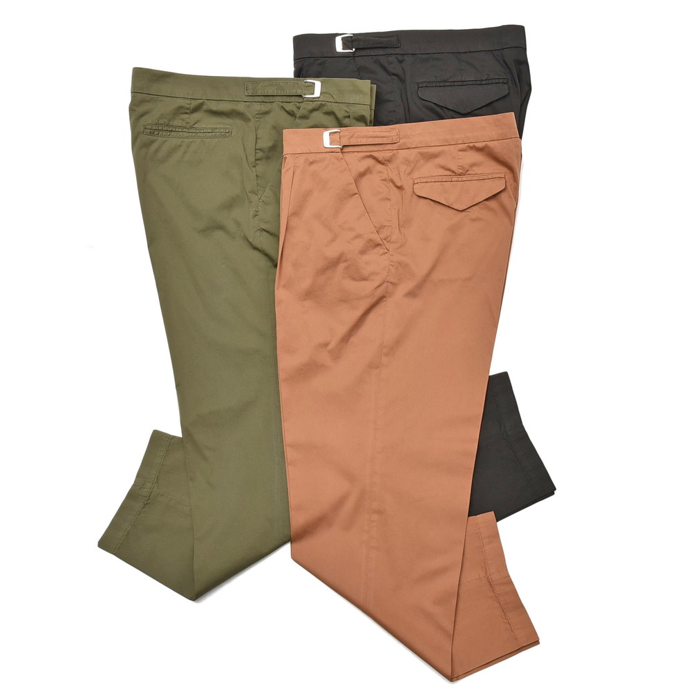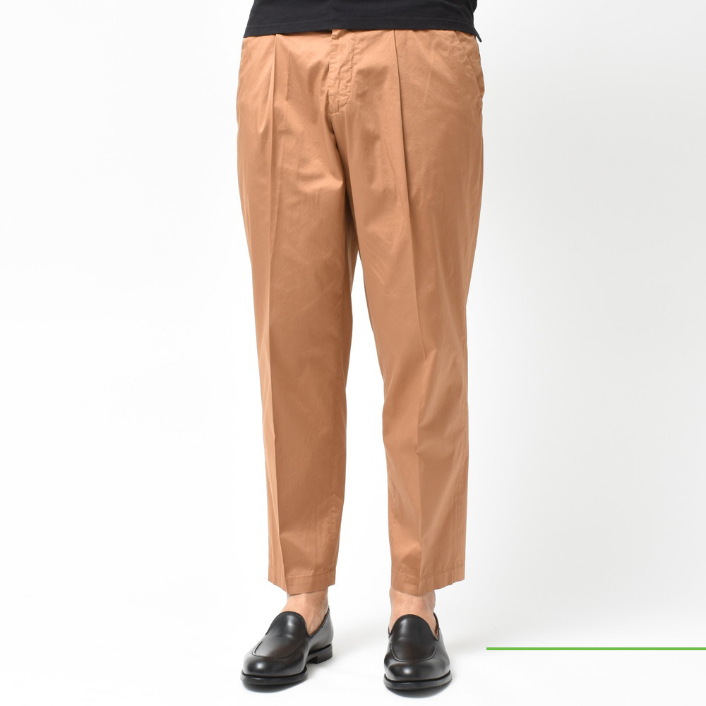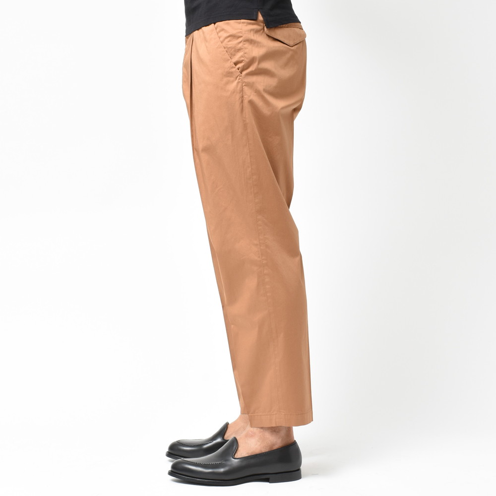 適度なリラックスさとデニムやチノなどのカジュアルパンツにはない上品さがあるCellarDoor(セラードアー)のコットンストレッチサテンサイドアジャスター1Pテーパードパンツ、ブランドお馴染みのシルエットに今回はやや光沢感のある生地を採用しておりまして、カジュアルパンツながらもほのかに漂う艶っぽさが素晴らしい存在に仕上がっています。
