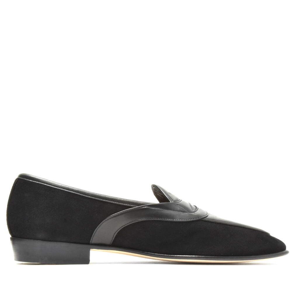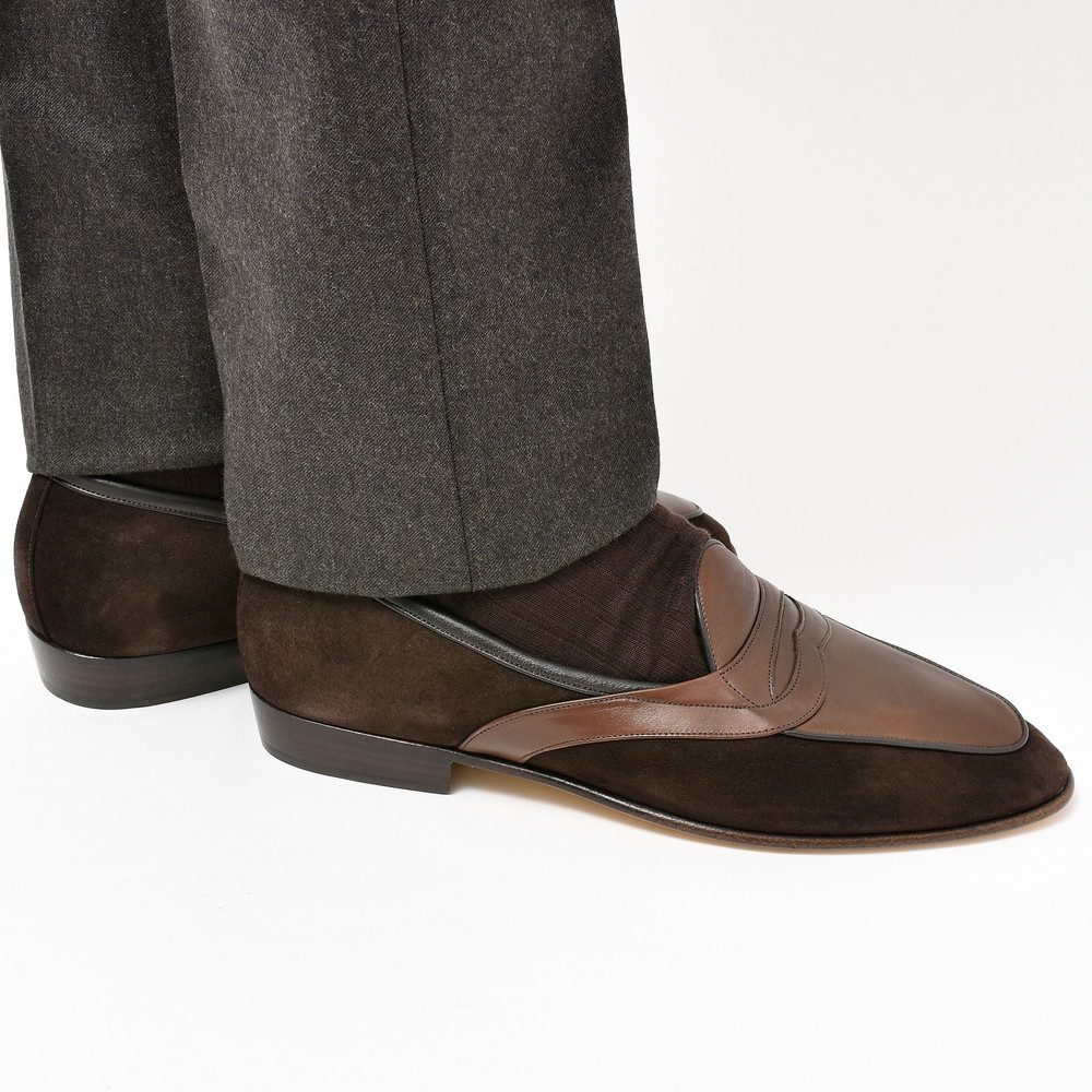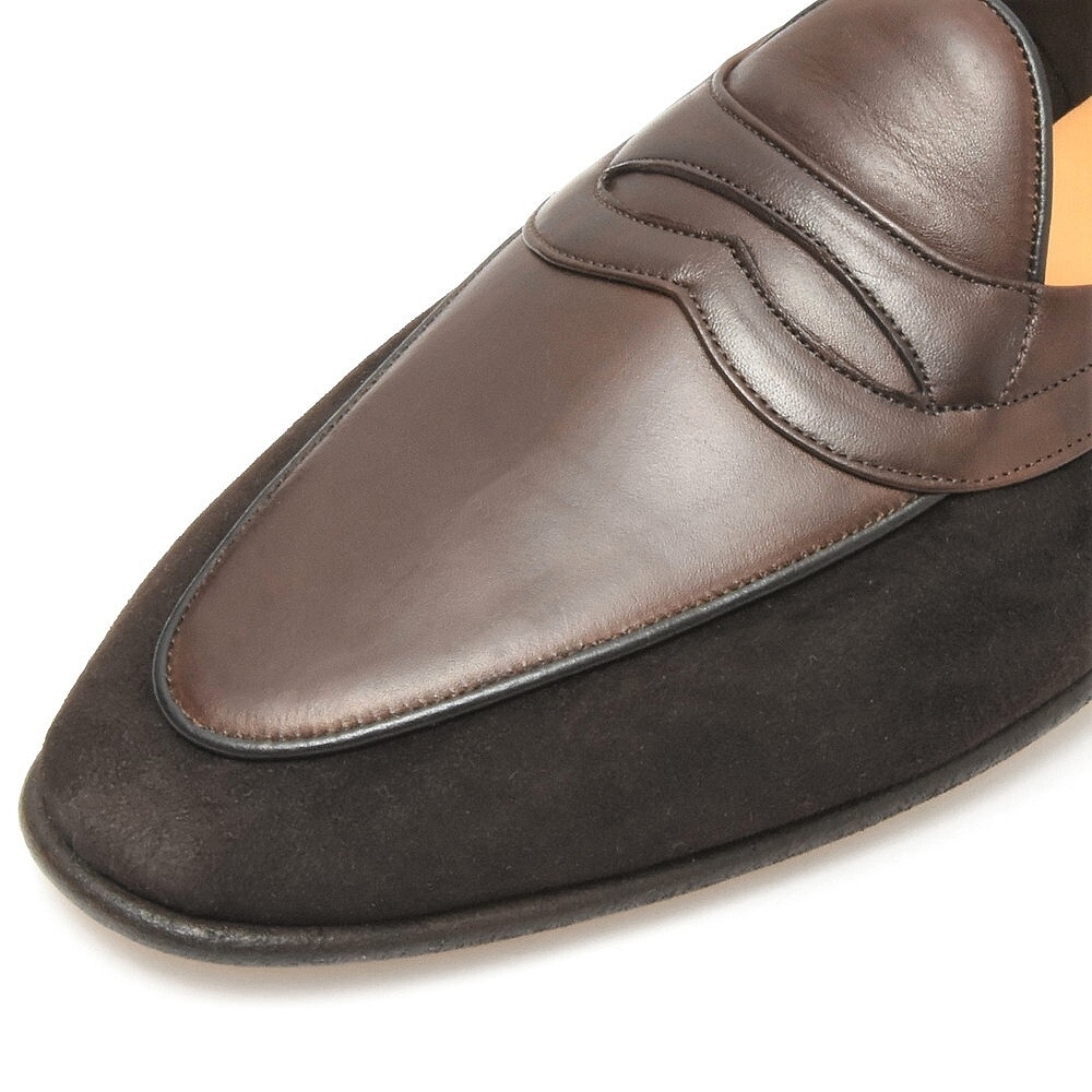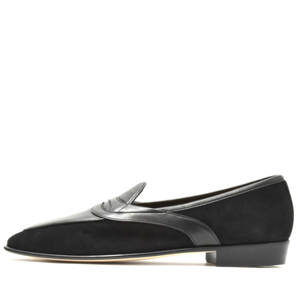 デザインは一般的なコインローファーと違い、ベルト部分を甲だけでなくサイドまで流しているところが特徴で、緩やかな曲線を描くようになっています。ベースがベルジャンシューズなので仕立てが非常に軽やかでして、その雰囲気に合ったエレガントな意匠かと思います。